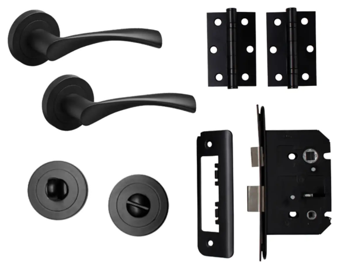 - Pack Contains: 1 x Pair of Lever on Rose Handles, 1 x 64mm Bathroom Lock, 1 x Bathroom Thumbturn Set, 1 x Pair of 76mm Ball Bearing Hinges