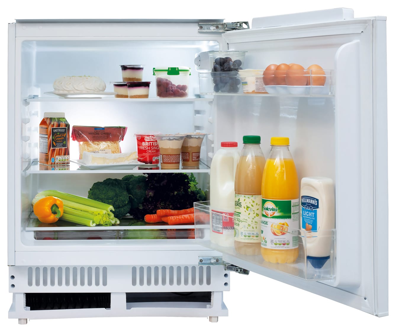 The Matrix Integrated Larder Fridge features three sturdy safety glass shelves within the fridge area, ensuring durable and flexible storage options. It includes two in-door balconies for maximum space efficiency and two salad crispers for organized vegetable and fruit storage. The height-adjustable feet allow for perfect alignment with your cabinetry, while the interior light provides clear visibility.