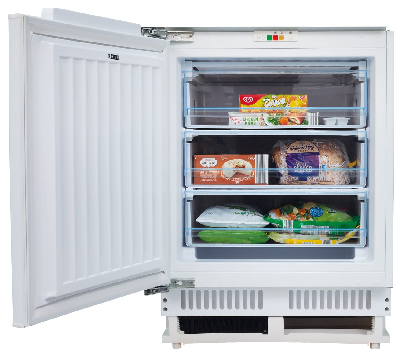 The Matrix Integrated Larder Freezer features three compartments with clear viewing windows for easy visibility of contents and includes a temperature warning light to alert you of any fluctuations. The reversible doors offer flexibility in installation, while height-adjustable feet ensure perfect alignment with your cabinetry. An ice cube tray is provided for convenience, and the fast freeze/super freeze function quickly lowers the temperature to preserve the freshness of new items.