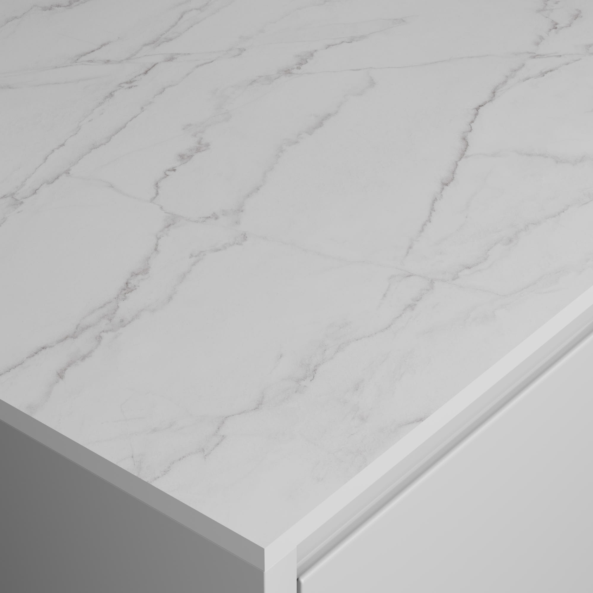 This smooth satin texture 12mm compact laminate breakfast bar takes design solutions to a whole new level as a slimline and durable alternative to Stone. Its hard-wearing, modern white veined marble design offers sleek lines combined with a high level of performance in the demanding kitchen environment. Its waterproof white core laminate is easy to move, cut, fit and maintain and can accommodate flush undermount sinks and engraved drainer grooves. Pair with worktops, upstands and splashbacks of the same range making an ideal addition to a contemporary kitchen.