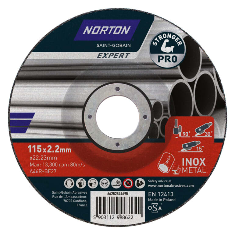 The Norton Expert Steel & Inox Cutting/Grinding Disc 115x2.2x22.23mm are professional quality discs for safe cutting of steel and inox. Additional reinforcements inside the disc and a thicker profile provide additional security when cutting and grinding.