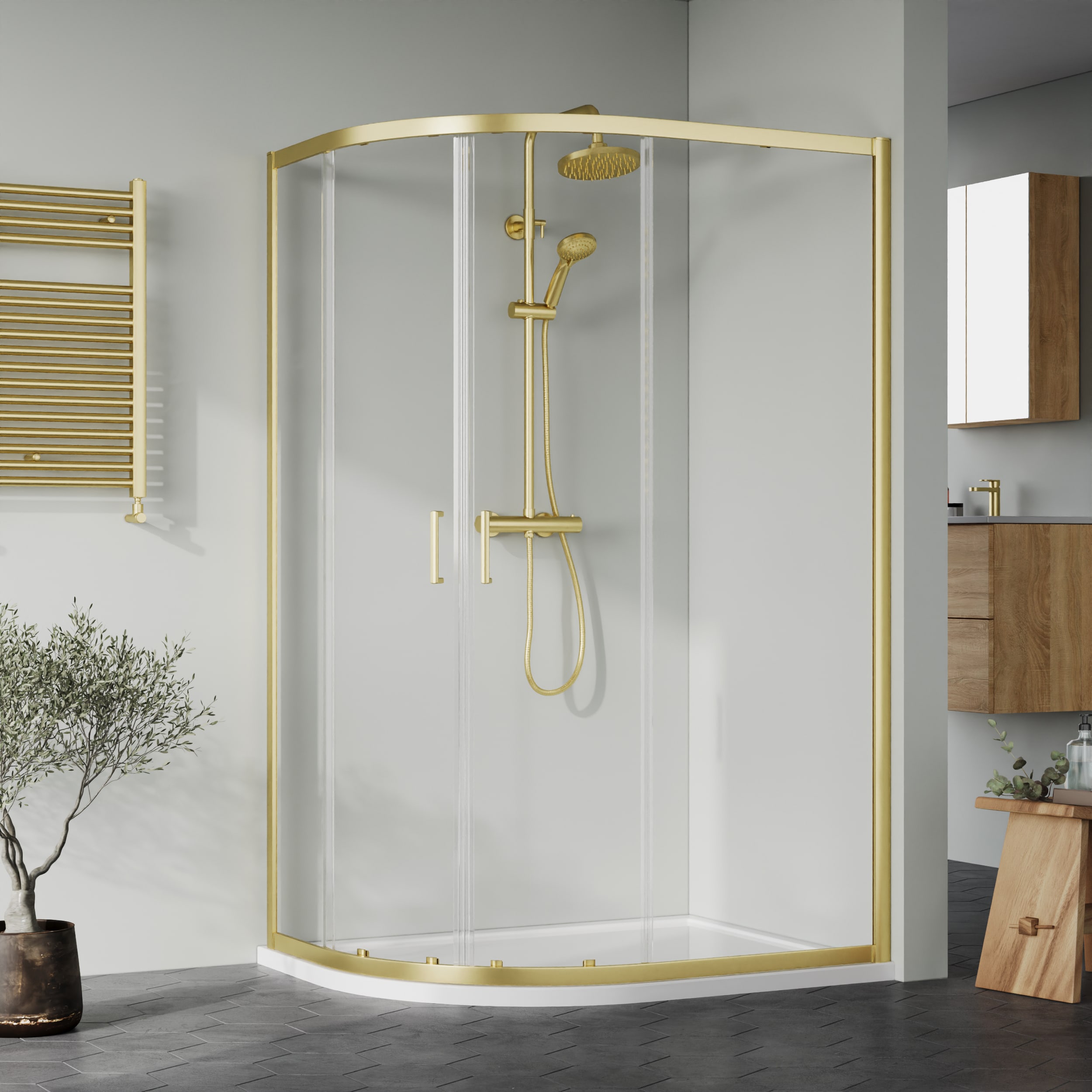 Nuie Brushed Brass Offset Left Hand Quadrant Tray & Waste Shower Enclosure Package - 1200 x 900mm