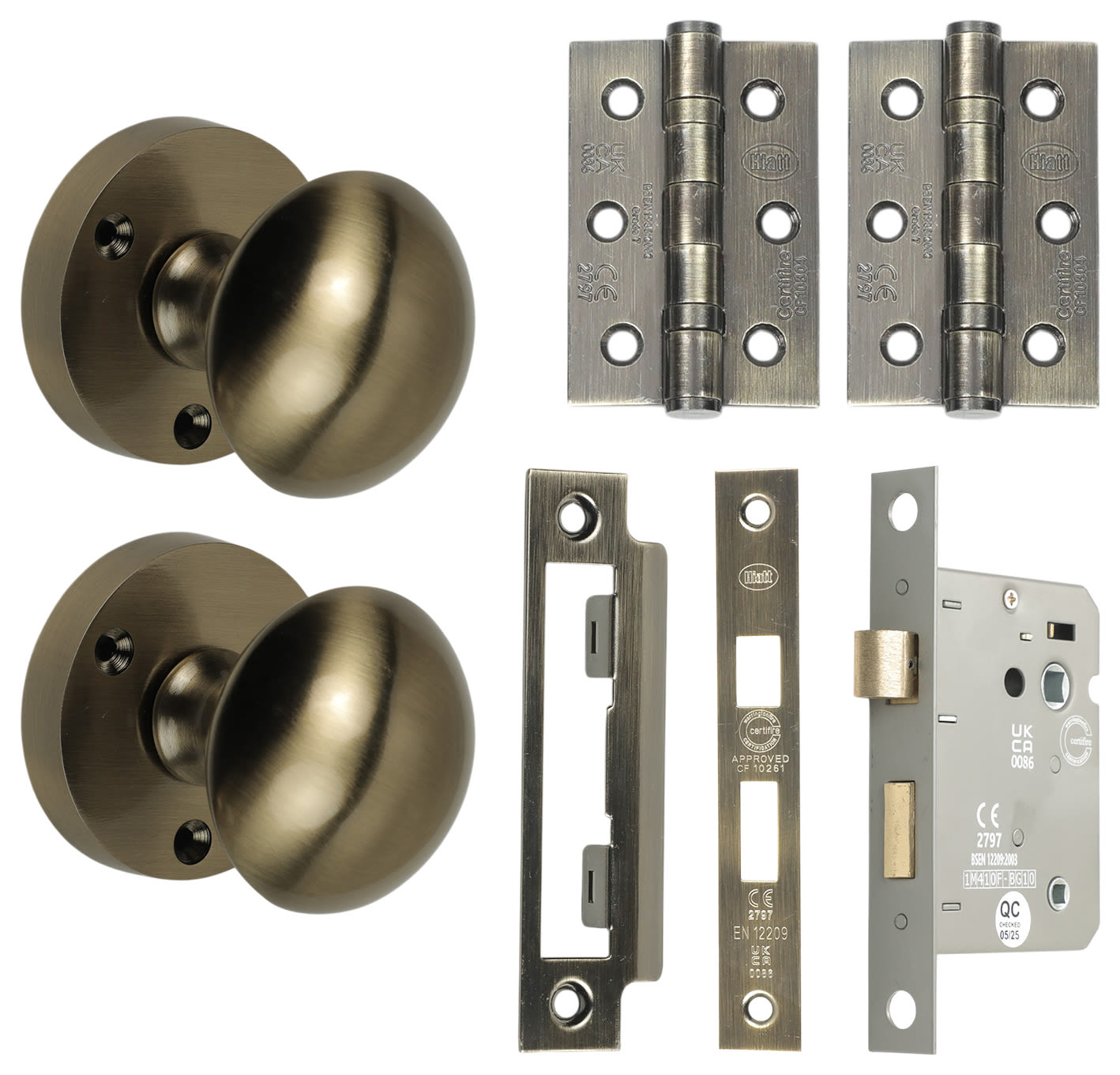 - Pack Contains: 1 x Pair of Mortice Door Knobs, 1 x 76mm Bathroom Lock, 1 x Bathroom Thumbturn Set, 1 x Pair of 76mm Ball Bearing Hinges