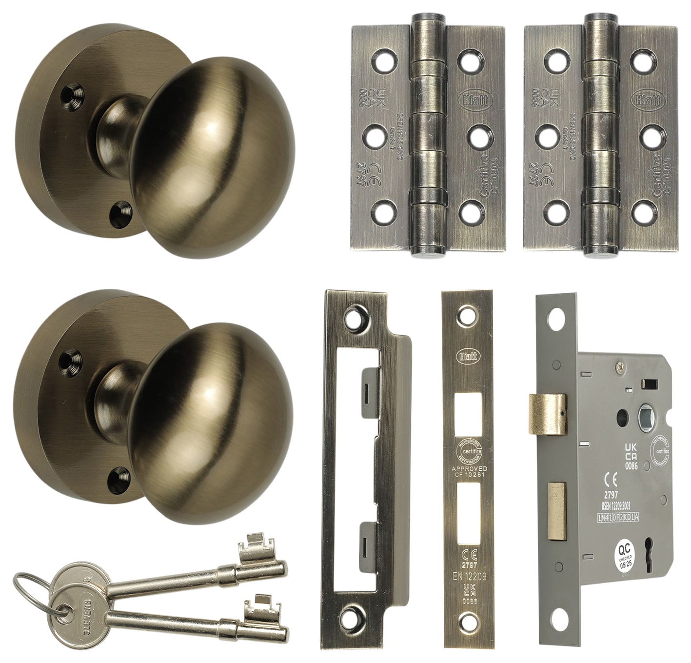 - Pack Contains: 1 x Pair of Mortice Door Knobs, 1 x 76mm 3 Lever Sash Lock, 1 x Pair of Keyhole Escutcheons, 1 x Pair of 76mm Ball Bearing Hinges