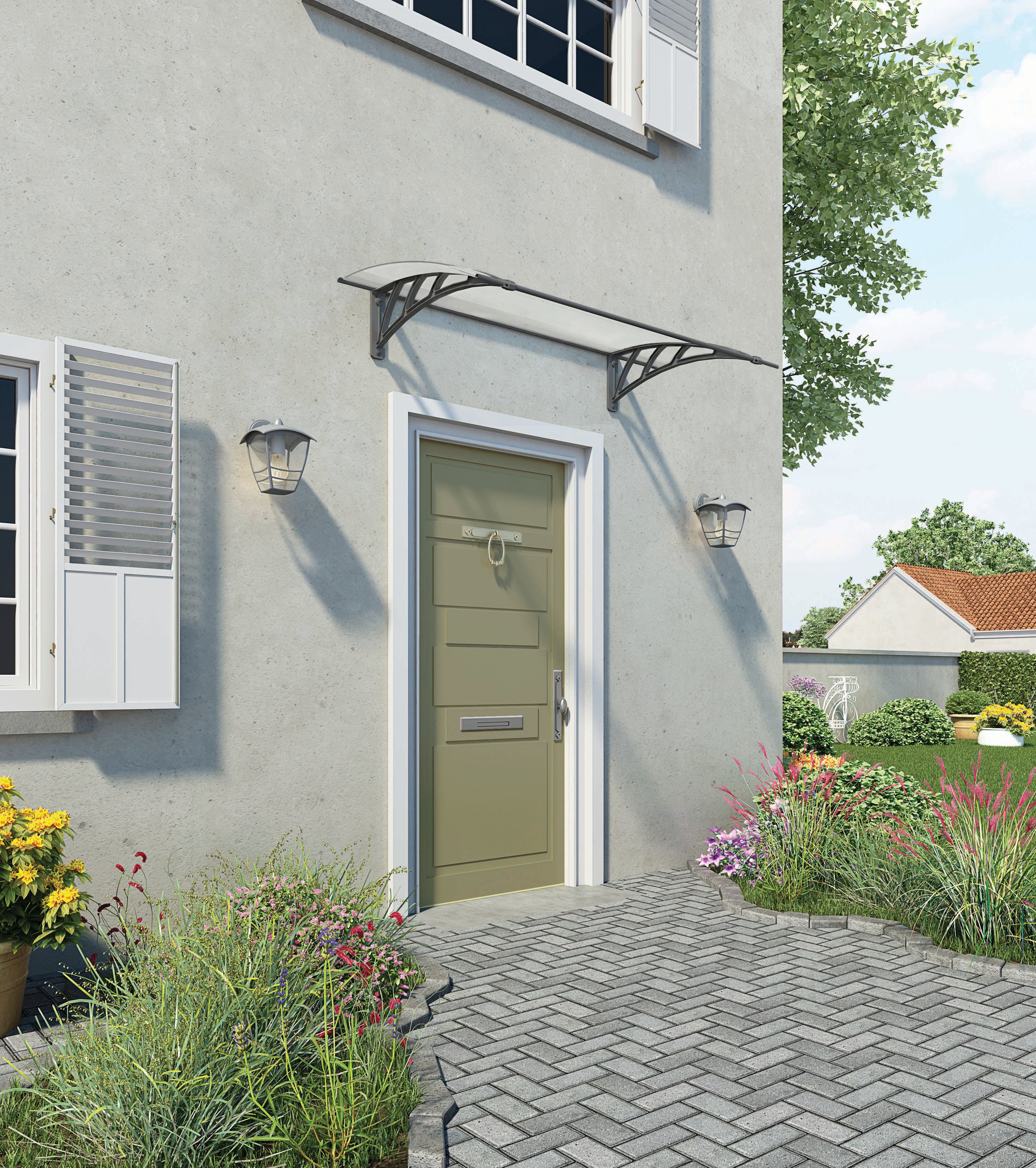 Palram Neo 1350 Grey Twinwall Polycarbonate Door Canopy decorates your doorways, entrance areas and windows aswell as protecting them from the harsh elements. This door canopy offers a stylish and durable solution for protecting your entrance from the elements. This modern canopy combines high-quality materials with a sleek design, enhancing your home's exterior while providing reliable weather protection.