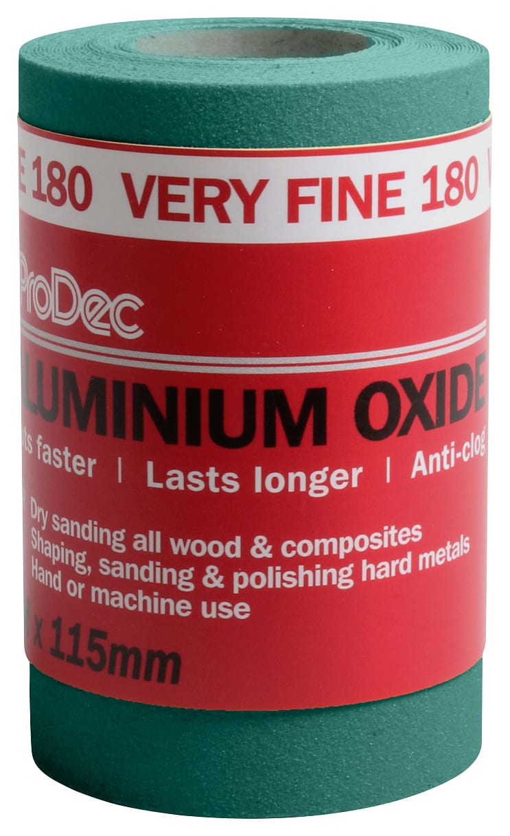 The ProDec Very Fine Sandpaper Roll is the abrasive of choice being suited to the widest variety of uses; the grains are more durable when compared to sandpaper, have a self-sharpening action and clog less, giving high performance sanding that outlasts sandpaper by up to 10 times. It's ideal both for hand sanding - with or without a sanding block - and machine sanding: at 115mm wide the roll is the standard width for power tools. The backing paper used in ProDec aluminium oxide is highly flexible and crack resistant so it withstands being creased and folded, making it ideal for sanding contoured or shaped surfaces, as well as being easy to cut for power tool use.