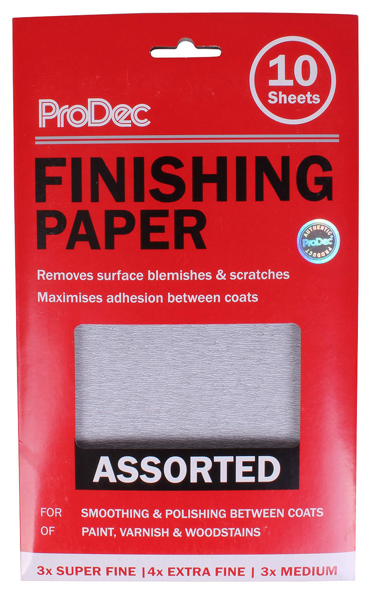 The ProDec Half Size Assorted Finishing Paper is used for sanding between coats to give a good adhesion key, removing surface blemishes or scratches prior to a final coat of paint, varnish or stain, and surface polishing. Suitable for use by hand or with machine sanders, it can be used dry like traditional paper or wet to minimise surface dust, which is especially important with the finer grades. Note that it is not suitable for removing previous coatings or first stage timber sanding - for these more aggressive sanding tasks use aluminium oxide paper instead.