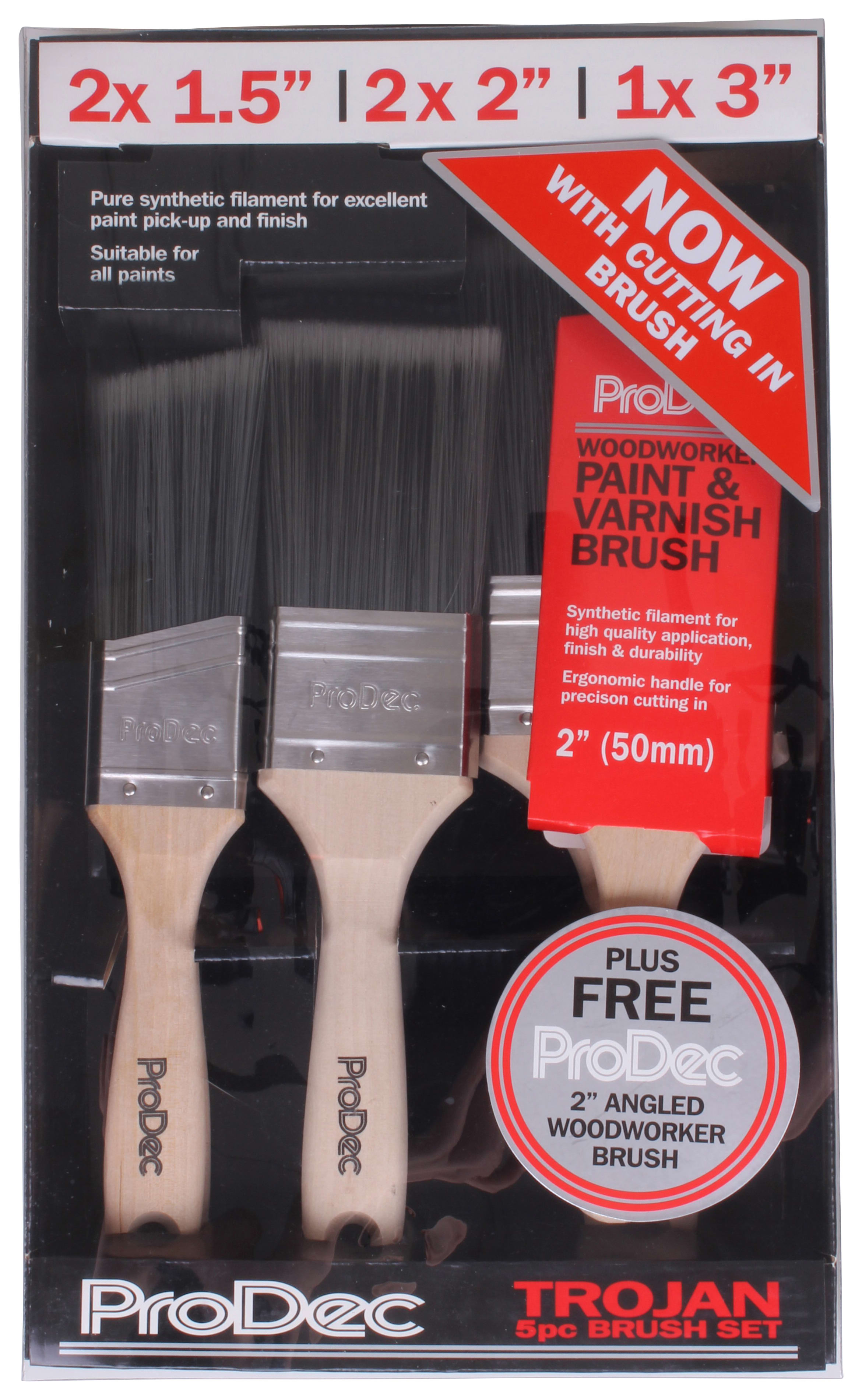 Featuring high quality synthetic filaments for a trade quality finish, the ProDec Trojan paint brush is perfectly suited for use with emulsion paints and water-based gloss or satin. Now includes a 1.5" Cutting In brush for precision cutting in at corners and edges.
