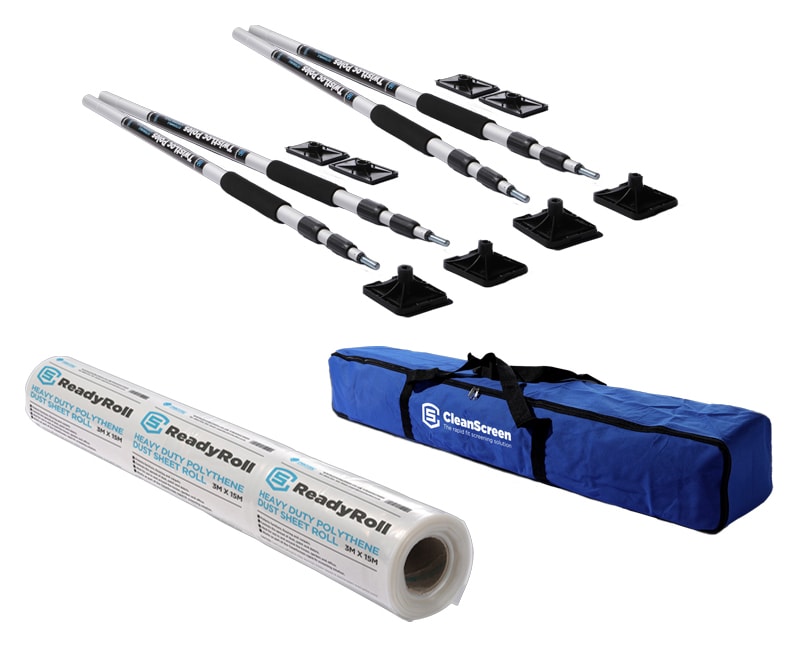 The Protec CleanScreen Kit contains everything you need to create a dust and debris containment area up to 15m, the kit contains four CleanScreen TwistLok 3m poles, one roll of CleanScreen ReadyRoll, and a carry bag to transport everything between jobs or keep safely together until the next one arises. The perfect partner if you carry out work that creates dust or debris and you want to save time tidying at the end of the job. The Twistlok poles enable you to secure ceiling heights from 1.28m up to 3m, the poles are made of lightweight aluminium to make them easy to transport and put up.
