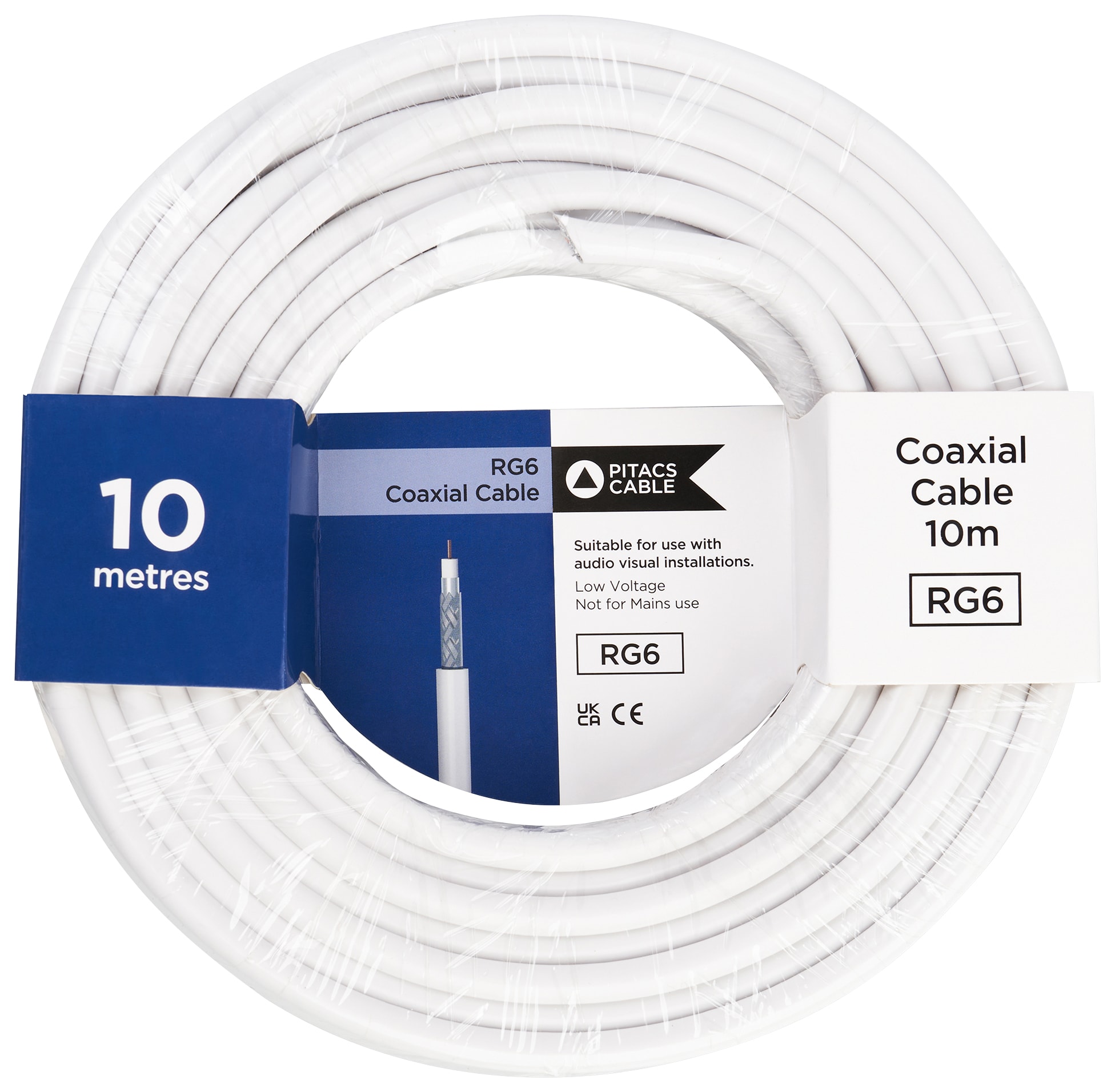 The RG6 Coaxial Cable is suitable for many applications, including low power video, video signal, and broadband signals. This 10m length of cable is engineered with precision to provide reliable connectivity and high-quality performance. Its white outer sheath that blends seamlessly with various environments, ensuring a clean and professional appearance.