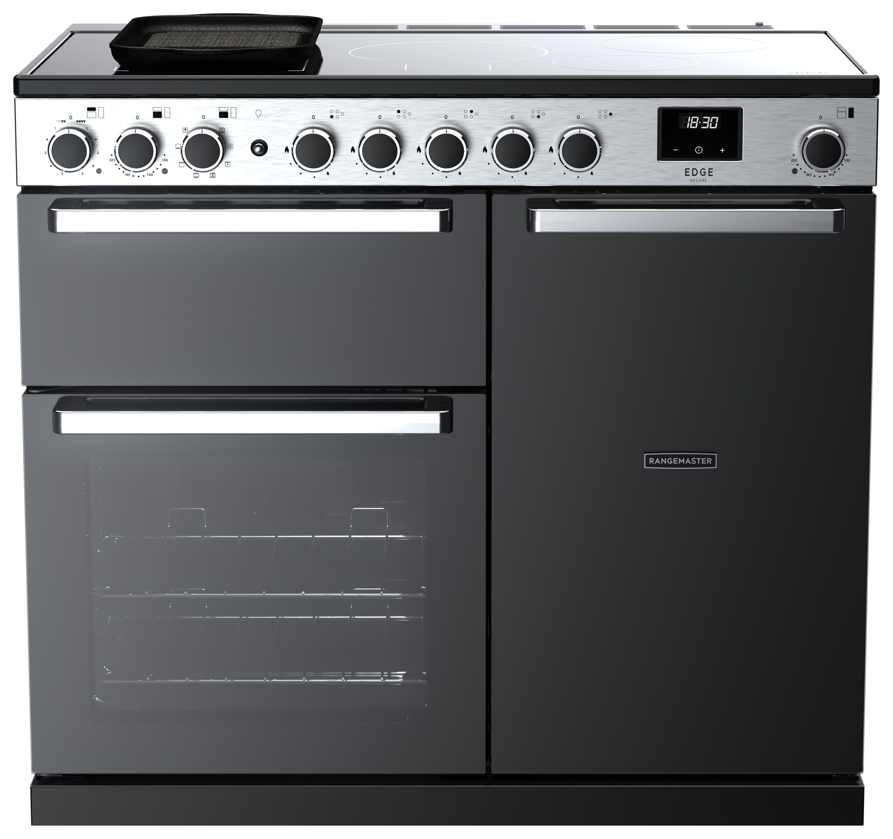 Sleek and frameless, the Edge Deluxe features a striking black glass aesthetic that seamlessly integrates into contemporary kitchens. Its ubiquitous design and pristine lines cater perfectly to those who appreciate modern aesthetics yet want the multifunctionality of a traditional range cooker.The 100cm width features an 80 litre multifunction oven, 82 litre tall fan oven, seperate dedicated deluxe 2.3kW Flexi-Grill and Series 2 Induction hob with bridging zone and removable griddle for true cooking flexibility. The Edge Deluxe has a timeless quality that effortlessly transitions from a statement modern appliance to the perfect culinary partner for all cooking requirements.