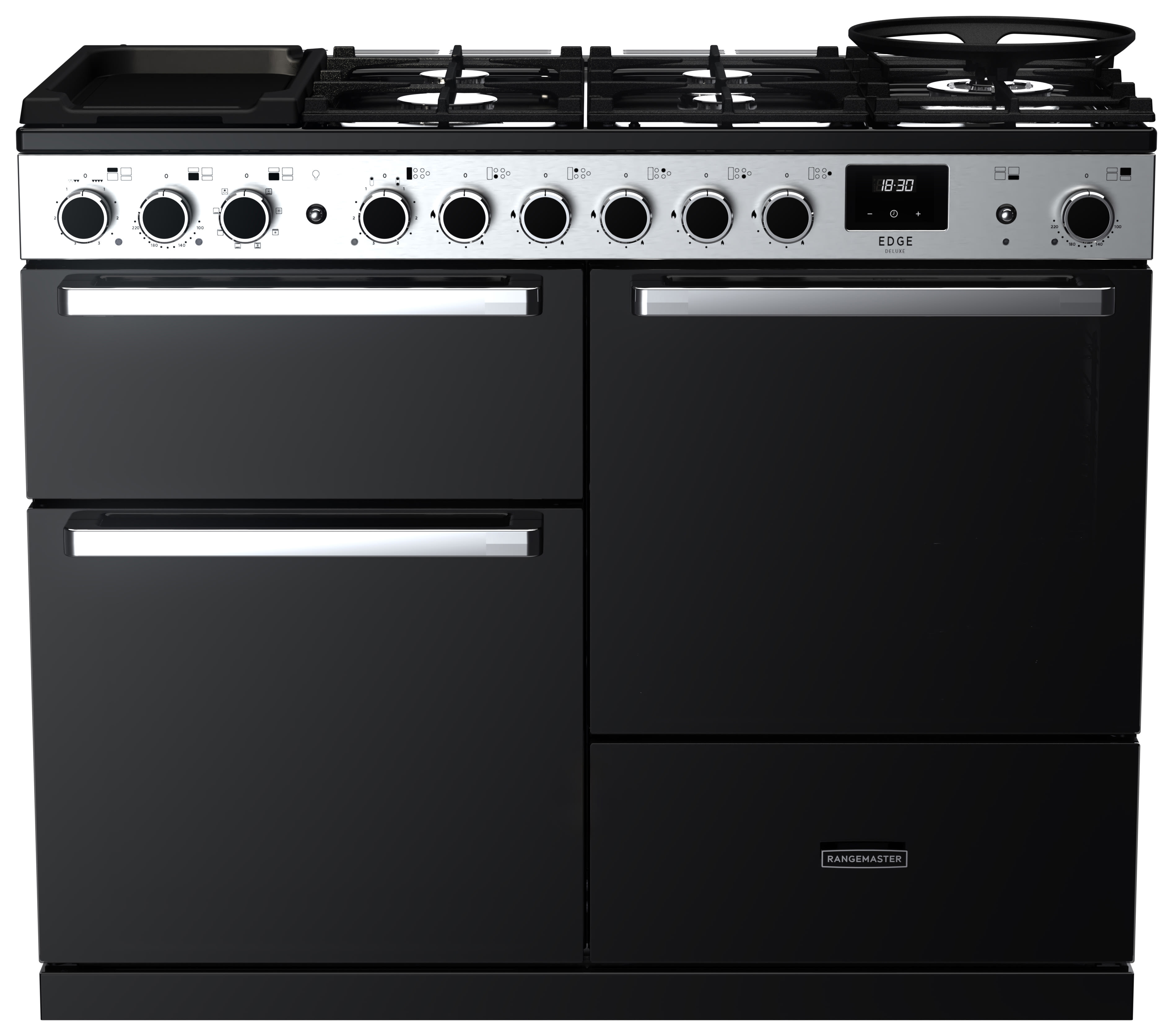 Sleek and frameless, the Edge Deluxe features a striking black glass aesthetic that seamlessly integrates into contemporary kitchens. Its ubiquitous design and pristine lines cater perfectly to those who appreciate modern aesthetics yet want the multifunctionality of a traditional range cooker.The 110cm width features an 80 litre multifunction oven, 80 litre fan oven, seperate deluxe 2.3kW Flexi-Grill, dedicated proving drawer and deluxe 5 burner gas hob with the addition of 2 ceramic zones with multi-zone griddle and wok cradle for true cooking flexibility. The Edge Deluxe has a timeless quality that effortlessly transitions from a statement modern appliance to the perfect culinary partner for all cooking requirements.
