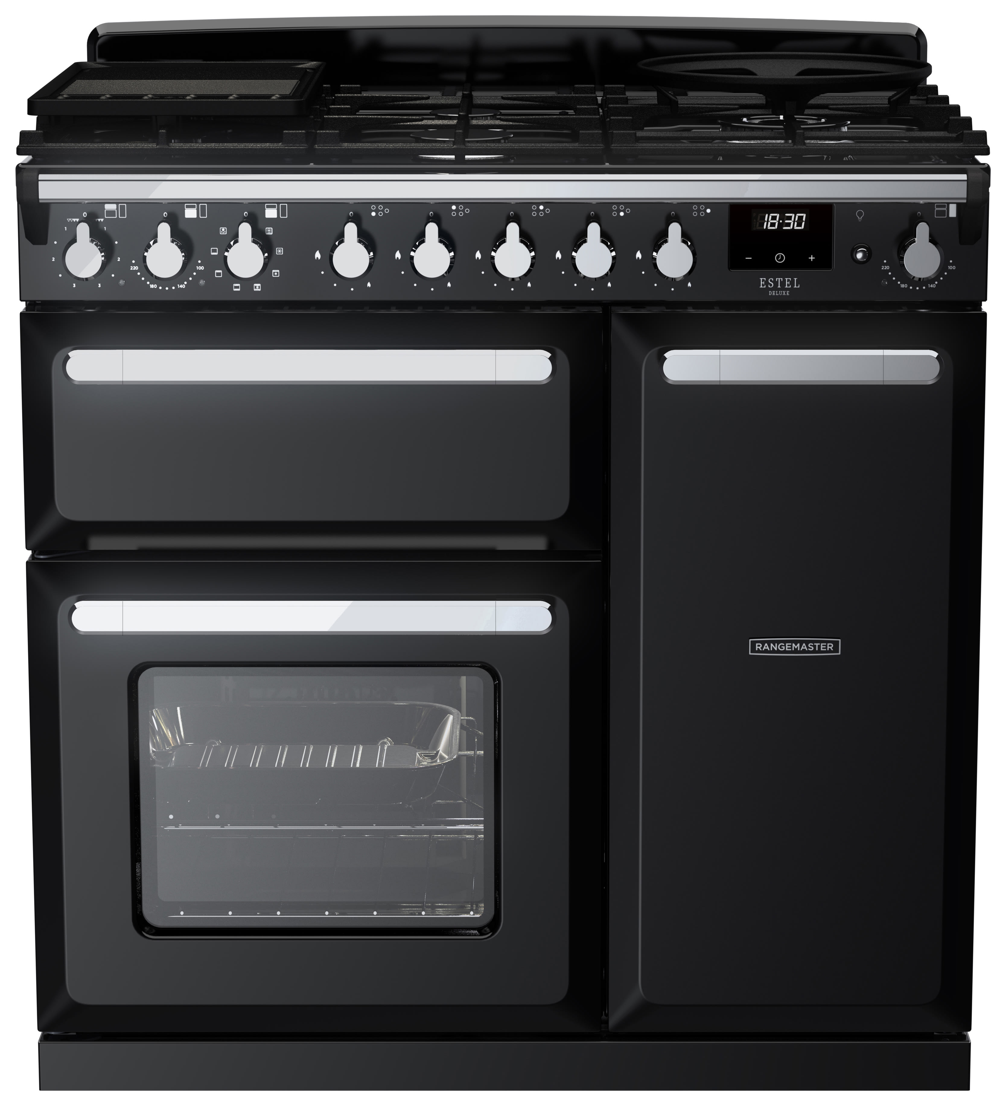 Rangemaster Estel Deluxe 90cm Dual Fuel Rangecooker - Gloss Black + Chrome