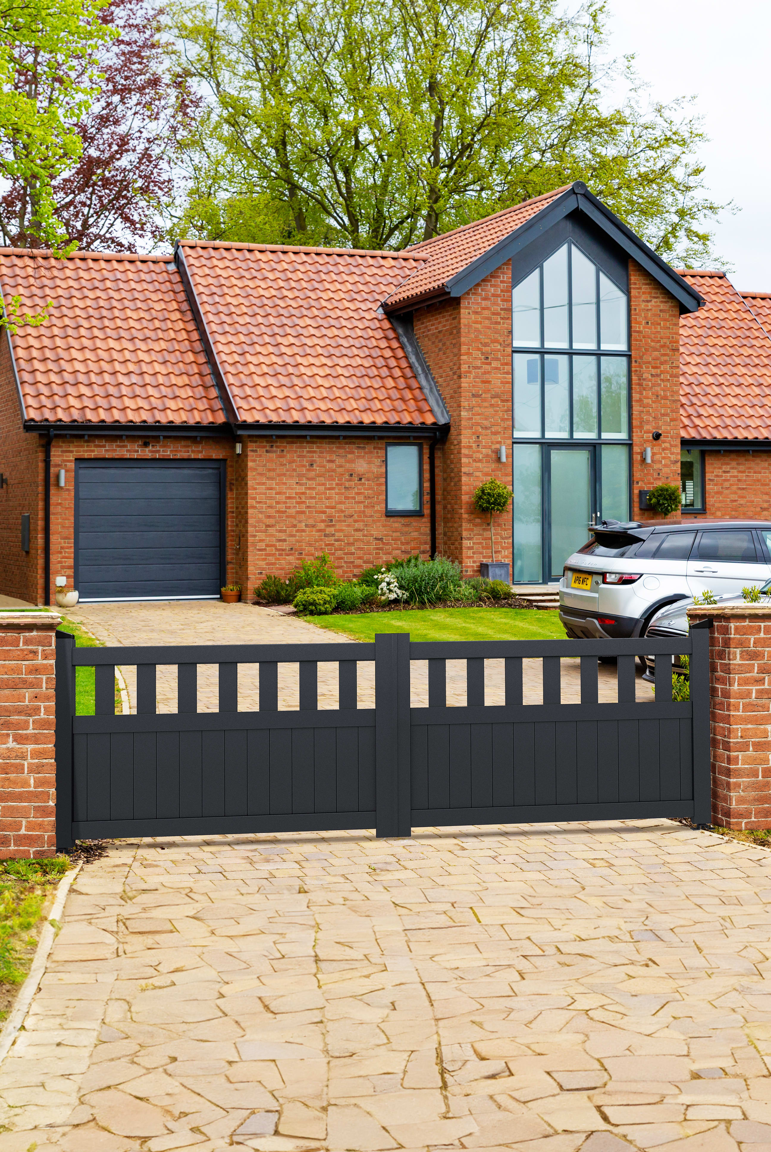 The Aluminium Flat Top Double Swing Driveway Gate features a modern and streamlined design. Its vertical solid infill ensures partial privacy to your home. Including 4 x large wall mounted hinges, and 2 x floor mounted hinges.