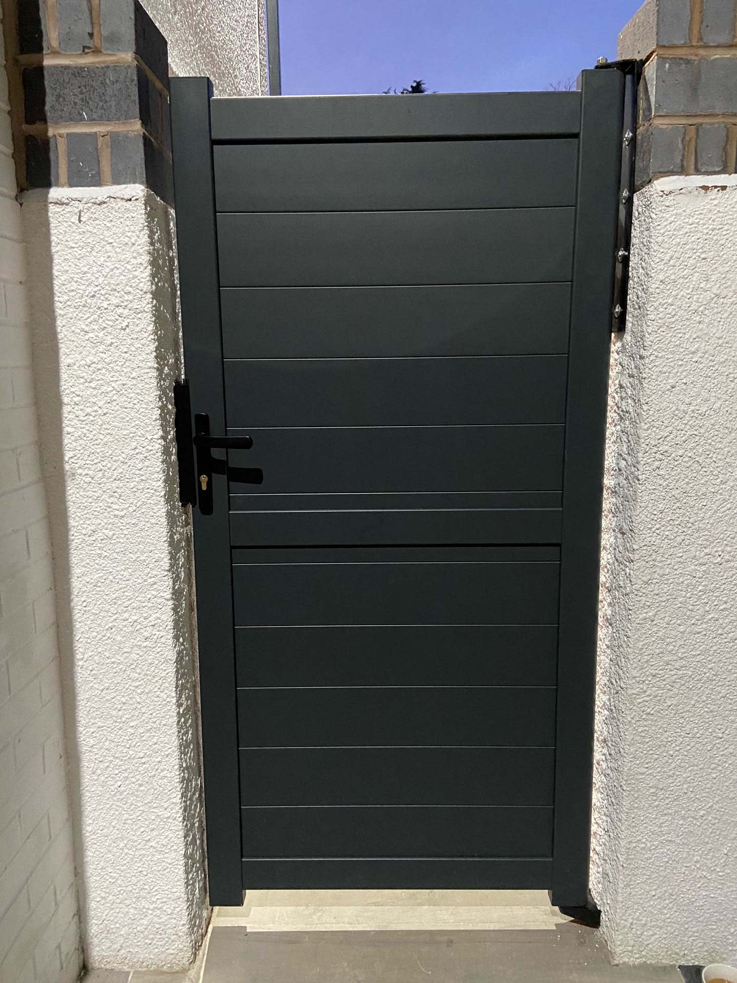 The Flat Top Aluminium Pedestrian Gate with horizontal solid infill by Readymade makes the perfect garden gate. It is a great option to ensure the maximum protection and full privacy of your property. Made from aluminium which makes this gate very strong, it is also lightweight which makes it a versatile material. Includes as standard, lock and handles, full-length lock keep, 2 x adjustable wall mounted and 1 x floor mounted hinges.