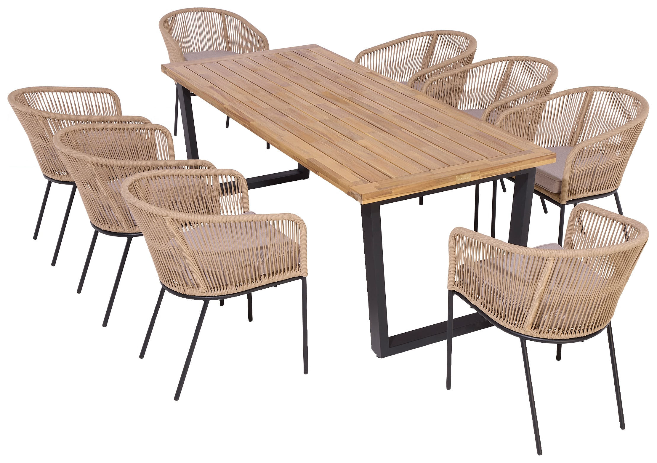 Rowlinson Oslo 8 Seat Dining Set has a bold design paired with function, providing the perfect place for family meals and social occasions. Featuring a durable acacia table top, with dark grey steel table and chair legs creating a striking contrast and industrial look. The Oslo also features contemporary natural coloured rope weave on the dining chair provides comfortable seating for up to eight people, making the Oslo a stylish set which is perfect for indoor or outdoor use.