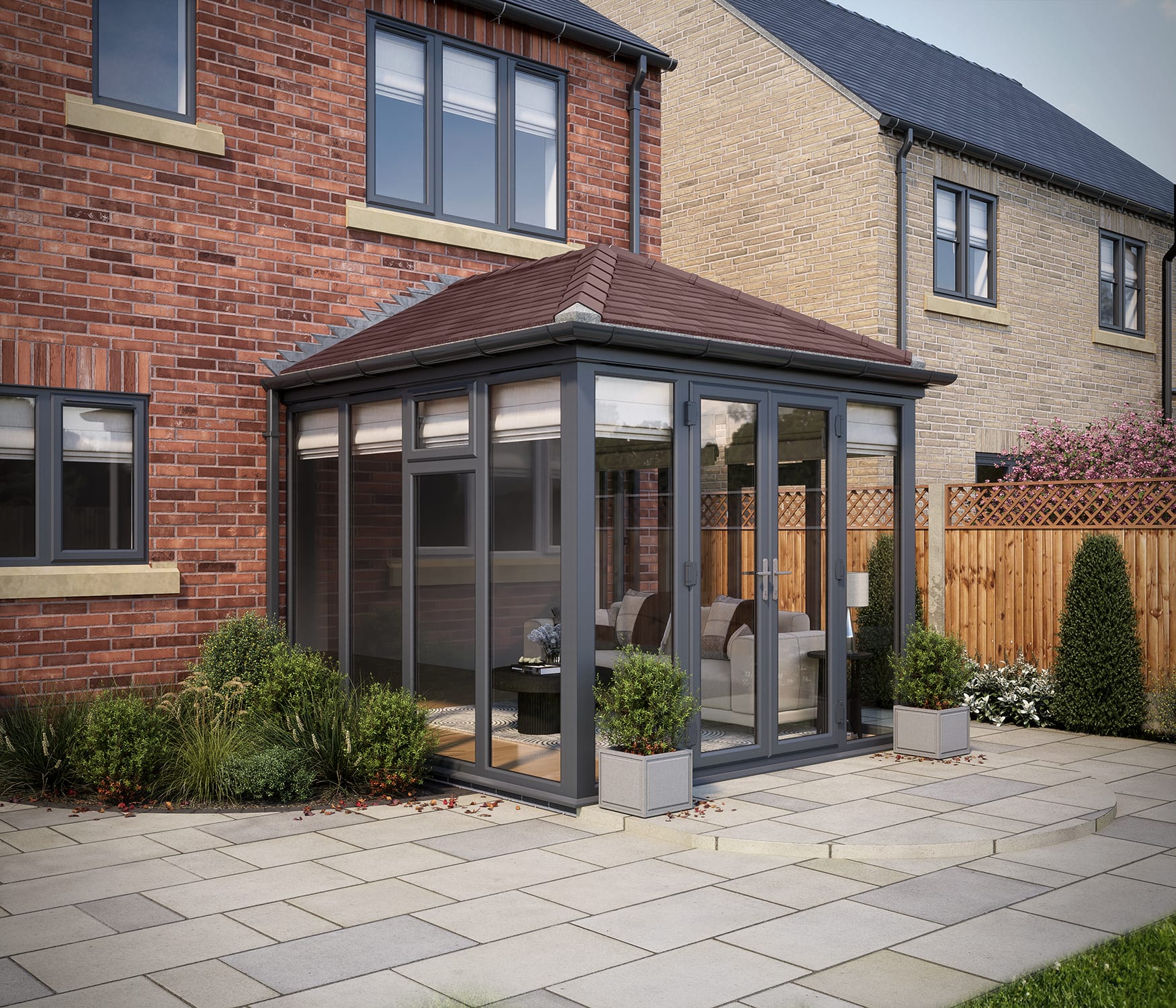 SOLid roof Full height Edwardian Conservatory Grey Frames with Rustic Brown Tiles