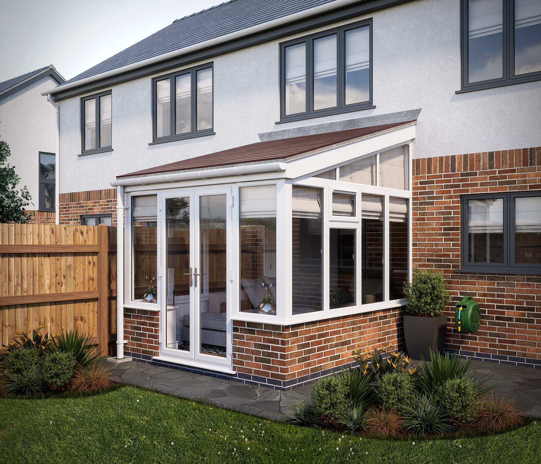 SOLid roof Lean to Conservatory White Frames Dwarf Wall with Rustic Brown Tiles
