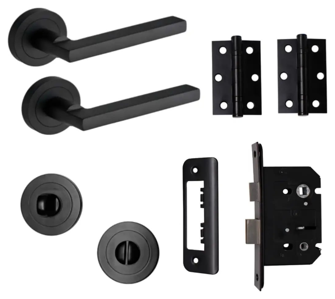 - Pack Contains: 1 x Pair of Lever on Rose Handles, 1 x 64mm Bathroom Lock, 1 x Bathroom Thumbturn Set, 1 x Pair of 76mm Ball Bearing Hinges