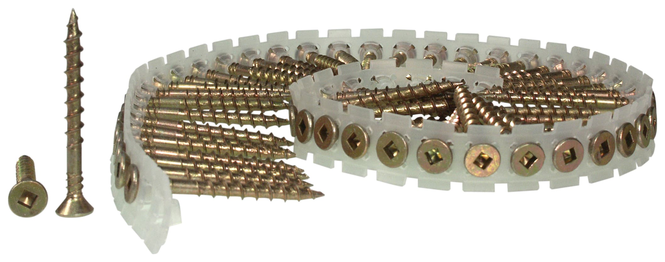 These Senco DuraSpin® collated screws are flooring and wood screws. They have a PH No.2 drive head and a yellow zinc finish with a coarse thread. 50 screws per collated strip which fit into the Senco DuraSpin® Collated screwdrivers. They are CE-marked (EN145566) and suitable for both cordless and mains-operated machines.