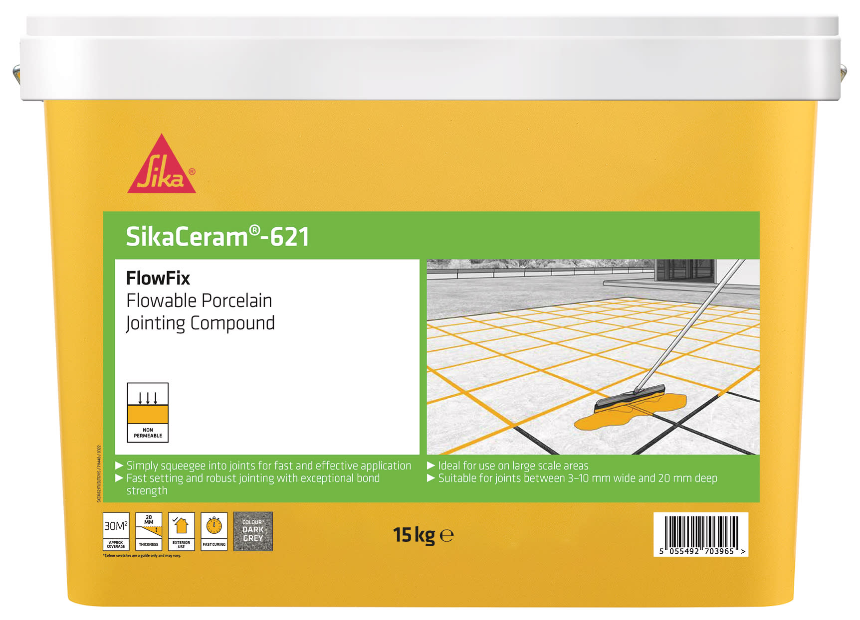 The SikaCeram FlowFix Porcelain / Ceramic Paving Jointing Compound is a ready to use (just add water), fast setting, flowable joint filling and grouting compound that is simple to apply and delivers exceptional bond strength, perfect for grouting large outdoor paved patios or areas with joints 3-10 mm wide and at least 20mm deep. For best result pay careful attention to the water to compound ratio when mixing and use as part of a two part porcelain tile application system with SikaCeram 62 FlowFix Porcelain Paving Bonding Primer. Leave 72 hours between priming and jointing however, in this time the tiles are foot trafficable after 12 hours depending on conditions if required.