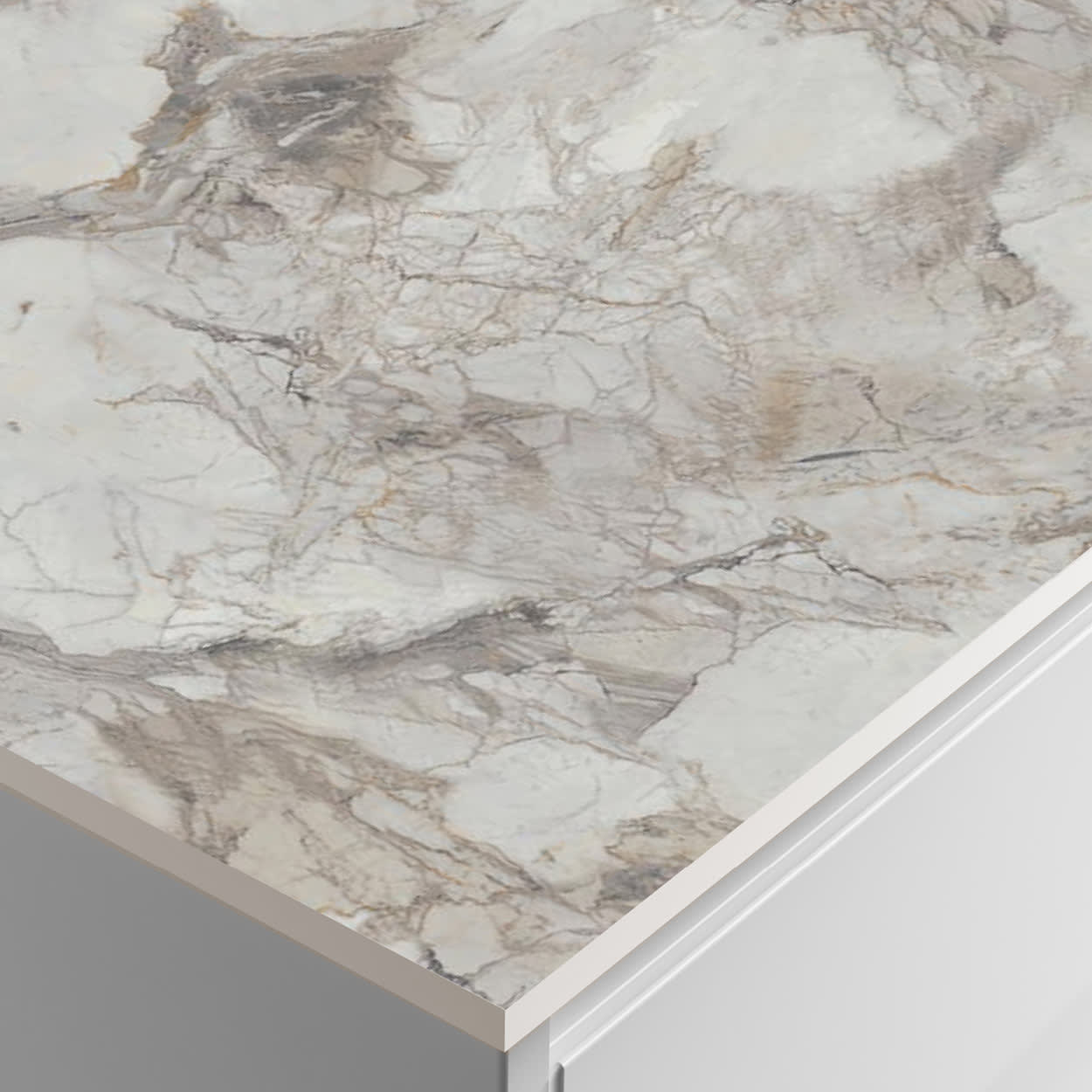 Zenith compact laminate worktops and breakfast bars combine beauty and durability with a slim, solid 12.5mm waterproof core. Designed to look, feel and perform like stone, Zenith surfaces can be easily fitted at home using standard installation tools. With no need for additional edging, Zenith is ideal for use with undermount sinks and can be engraved with drainer grooves for a sleek and streamlined finish. Inspired by the beauty of real stone, the elegant Smoked Marble design features contrasting tones of creamy beige and warm grey to add a touch of luxury to your kitchen.