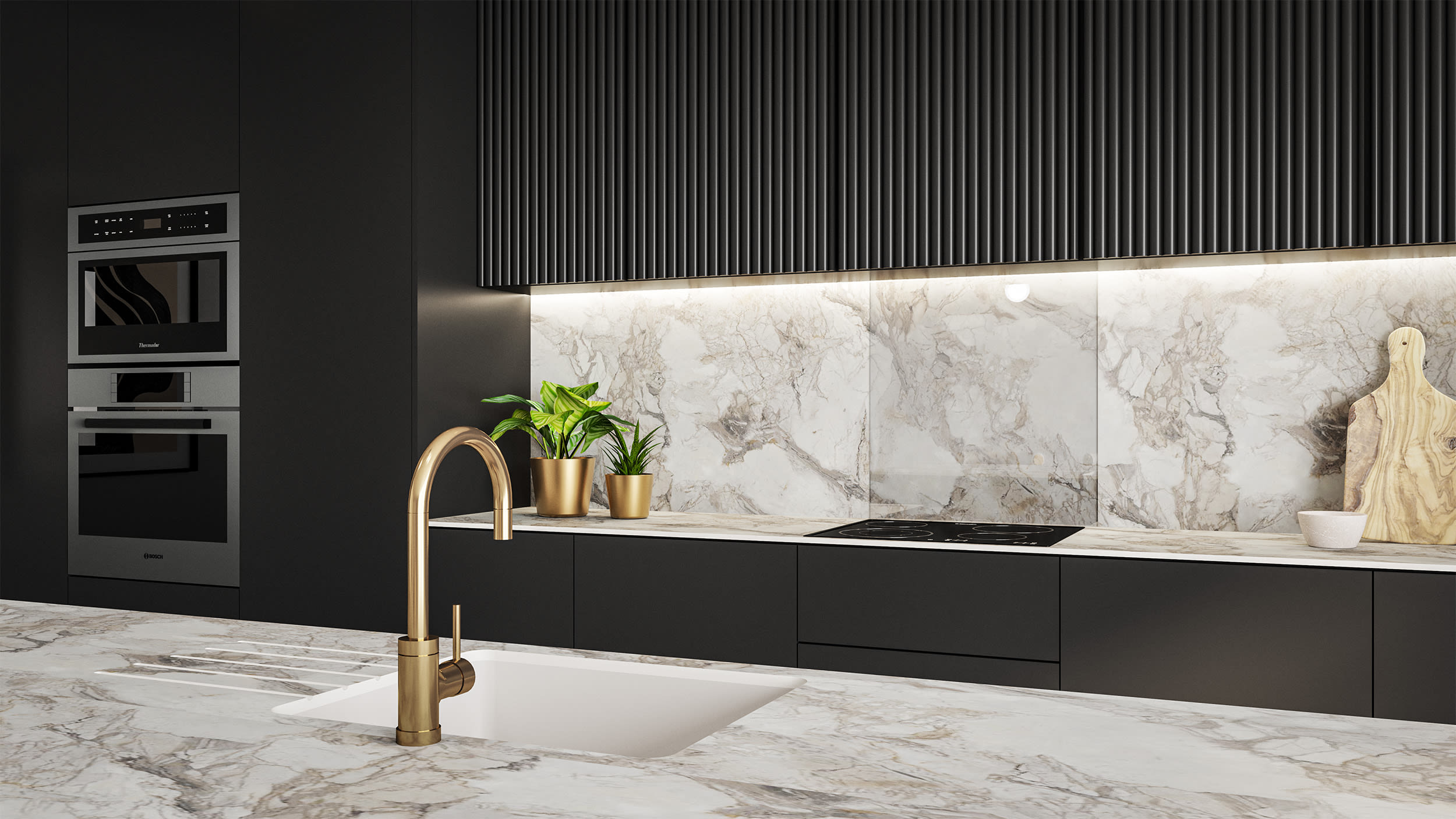 - Use alongside the Smoked Marble Zenith worktop to continue your decorative surface up the wall for a truly bespoke finish