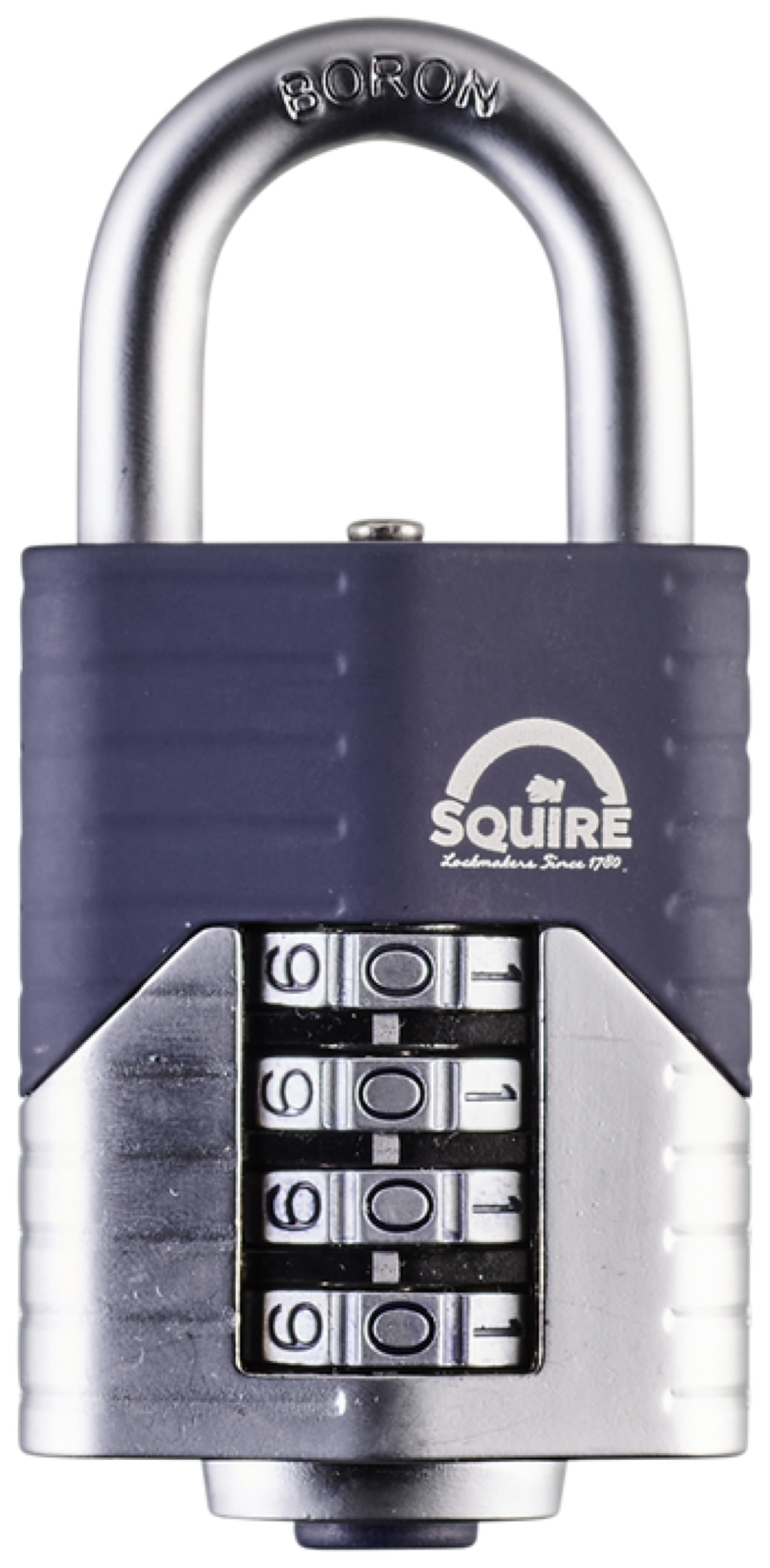 The Squire Combination Padlock is designed for robust protection of gates, vans, sheds, heavy goods vehicles, lockups, and garages. It features a durable die-cast alloy body with a satin chrome cover and an 8mm hardened boron open shackle, providing enhanced resistance against cutting and tampering. The padlock's 4-wheel re-codeable combination offers 10,000 possible combinations, eliminating the need for keys and reducing the risk of lost access.