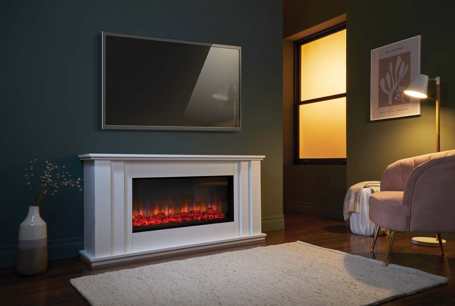 The Suncrest Kesgrave Electric Suite has a grand appearance, and is sure to make a statement in any home. Available in a textured white finish, with matching textured white hearth, it’s low level is perfect for mounting a television above. The LED flame effect has 3 flame settings, realistically flickers and illuminates the glowing log bed beneath. If you want the flames without the heat, the flame effect only setting will ensure you can sit back and enjoy the flames gently flickering without the heat. Supplied with a smart remote control, the electric fire produces up to 2kW of heat, 7 day programmable timer, draught detection and adaptive start operation. It is a flat to wall fireplace, does not require a chimney breast, comes fully assembled and is covered with a 1 year warranty.
