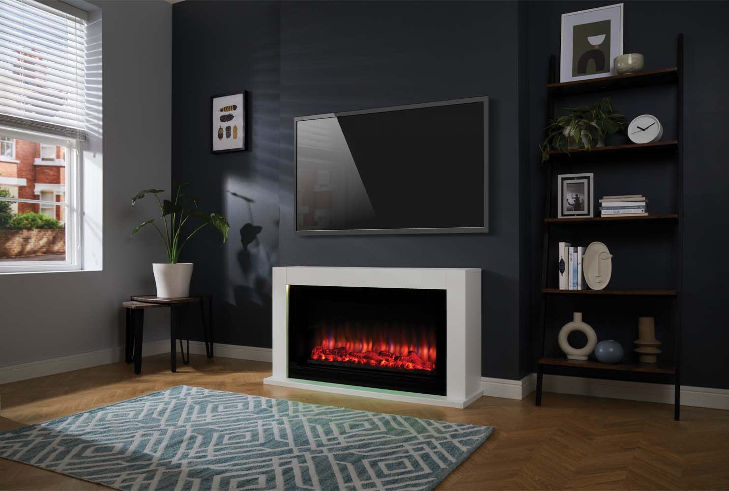 The Suncrest Lumley Ambience Electric Suite is a stunning low level electric fireplace with widescreen flame effect, perfect for mounting a television above. The Lumley comes in textured white with an attractive black gloss frame border which completes this truly stunning fireplace. If you want the flames without the heat, the flame effect only setting will ensure you can sit back and enjoy the flames gently flickering without the heat. 13 different ambient mood lighting colour settings give you even more control. LED flame effect has 3 flame settings, realistically flickers and illuminates the glowing log bed beneath. Supplied with a smart remote control, the electric fire produces up to 2kW of heat, 7 day programmable timer, draught detection and adaptive start operation. It is a flat to wall fireplace, does not require a chimney breast, comes fully assembled and is covered with a 1 year warranty.