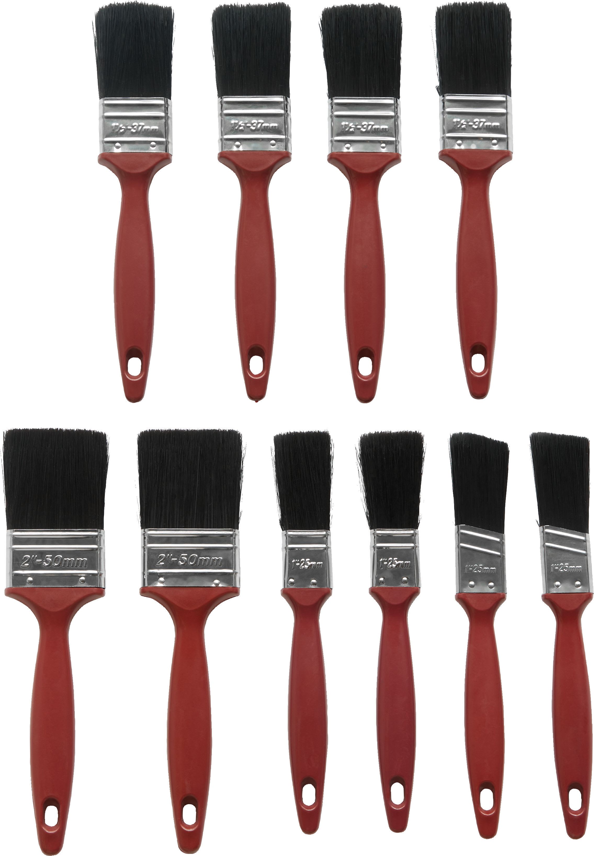Pack of 10 paint brushes with synthetic filaments. Includes 2 x 1in brush, 4 x 1.5in brush, 2 x 2in brush & 2 x 1in angled brushes.