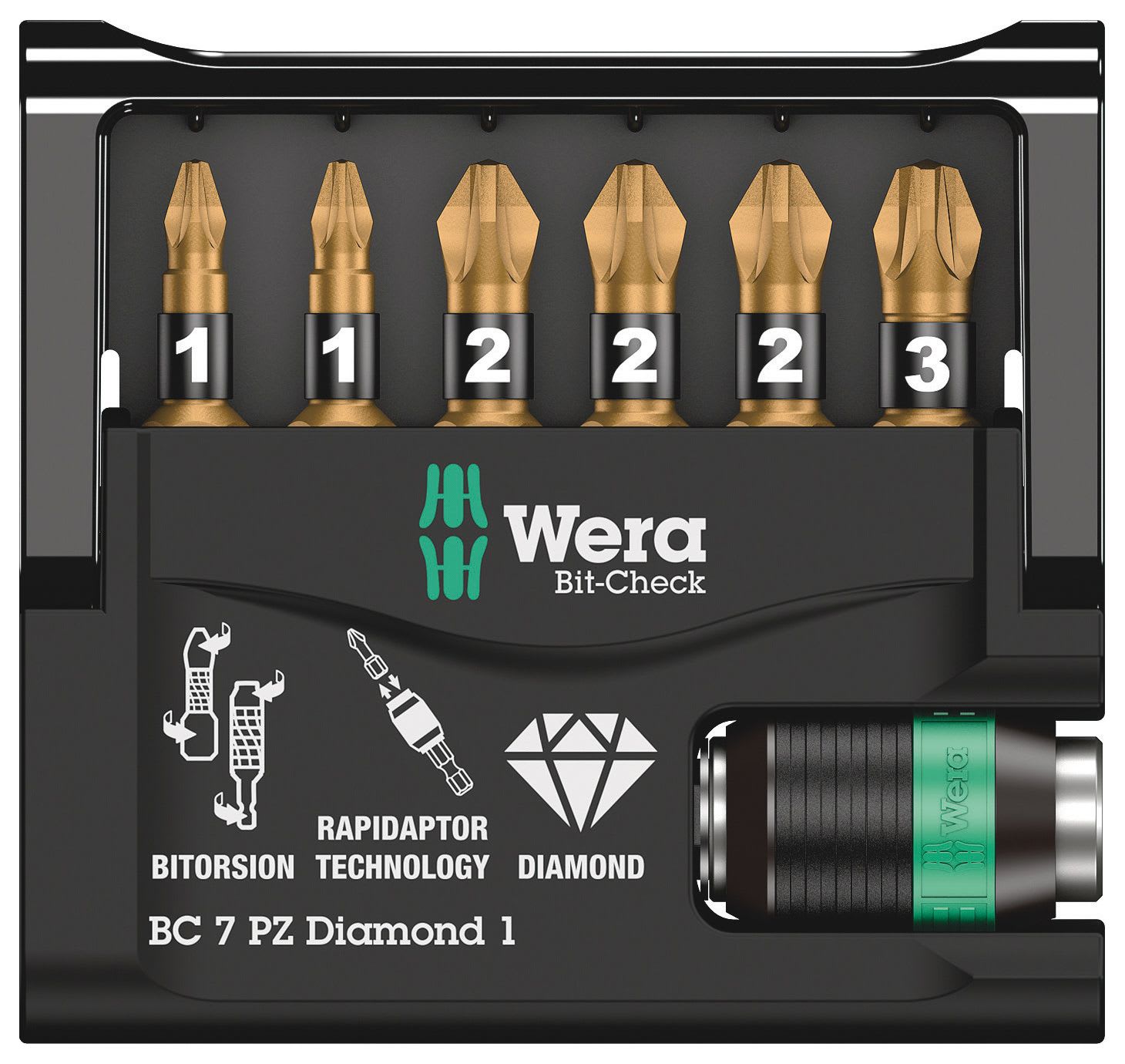 The Wera 7 Piece PZ diamond Bit with tiny diamond particles on the bit tip. This ensures a secure fit in the screw head, reduces the contact pressure required and lowers the risk of slipping. Comes with Rapidaptor technology, which allows bits to be attached without any need to actuate the sleeve. The removal of the bit is simple, just by pushing the sleeve forward – for rapid bit change with just one hand. For insertion in the power screwdriver or into the chuck of the power drill. The profile and size of the bits are easy to recognise thanks to the Wera "Take it easy" Tool Finder with its colour coding and clearly visible imprint.