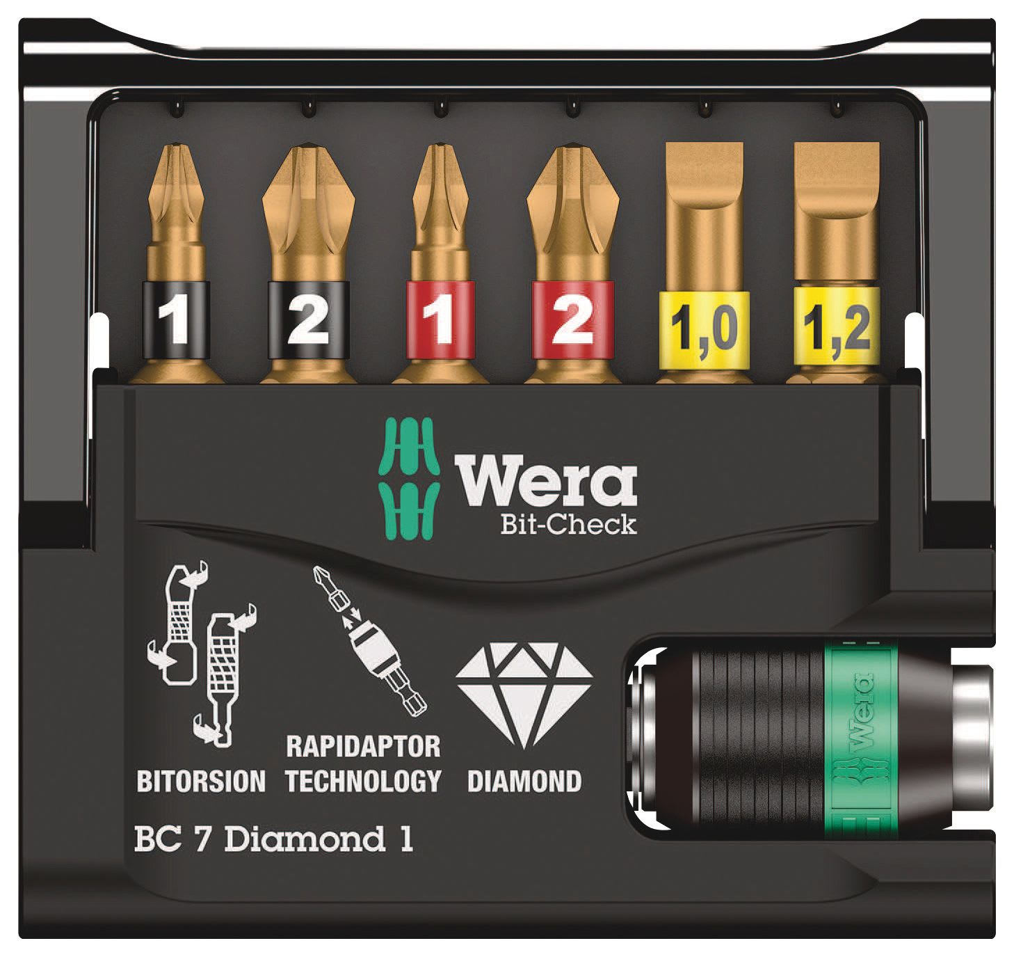 The Wera 7 Piece diamond PZ/PH/TX Set of bits with tiny diamond particles on the bit tip. This ensures a secure fit in the screw head, reduces the contact pressure required and lowers the risk of slipping. BiTorsion bits with an elastic torsion zone “ where kinetic energy is diverted from peak loads “ and softer BiTorsion zone to prevent the bit tip from twisting under high strain. Comes with Rapidaptor technology, which allows bits to be attached without any need to actuate the sleeve. The removal of the bit is simple, just by pushing the sleeve forward for rapid bit change with just one hand. For insertion in the power screwdriver or into the chuck of the power drill.