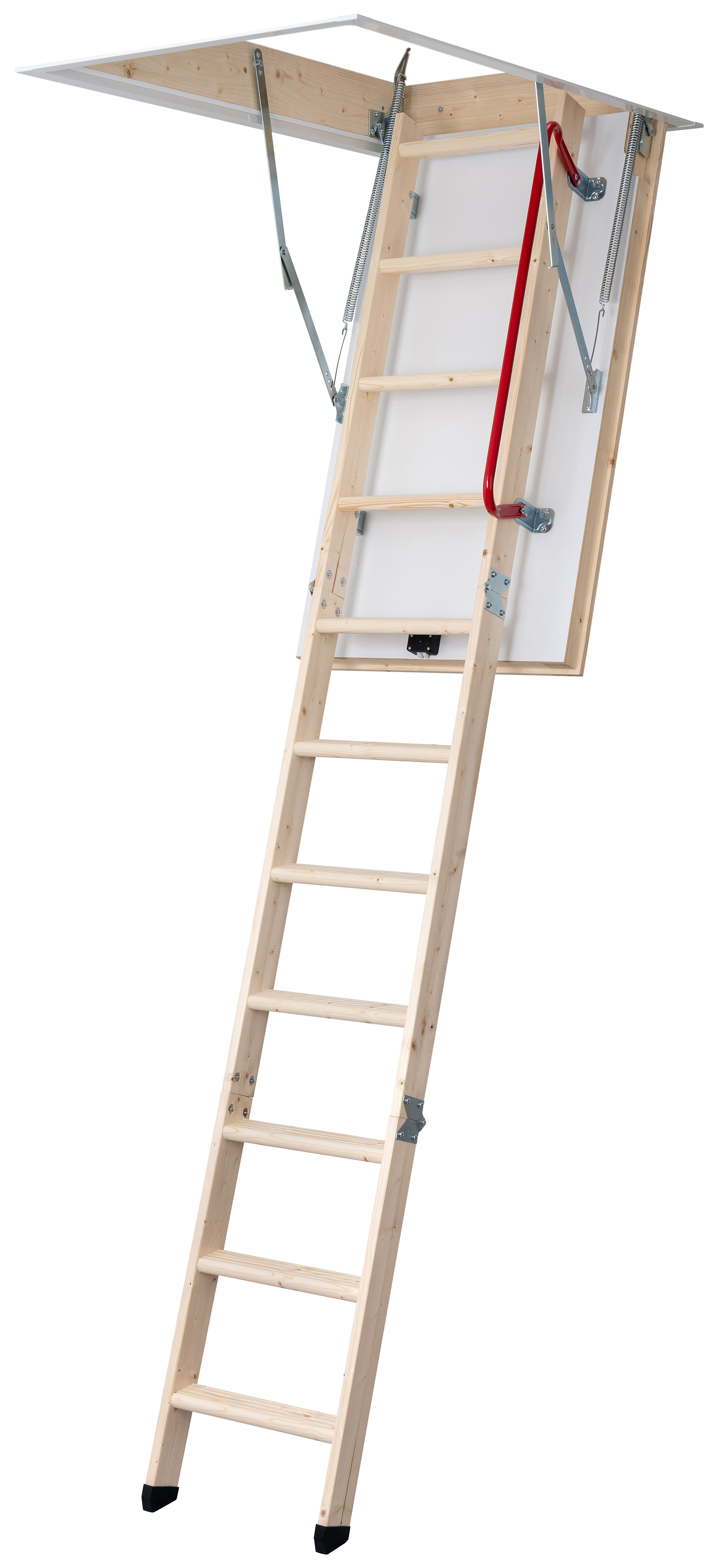 - Supplied as a semi-assembled unit with a compact three-section timber loft ladder, insulated draught-proof trapdoor, handrail, loft surround, hinge clip, spring-assisted stowage mechanism, and a timber stowing pole
