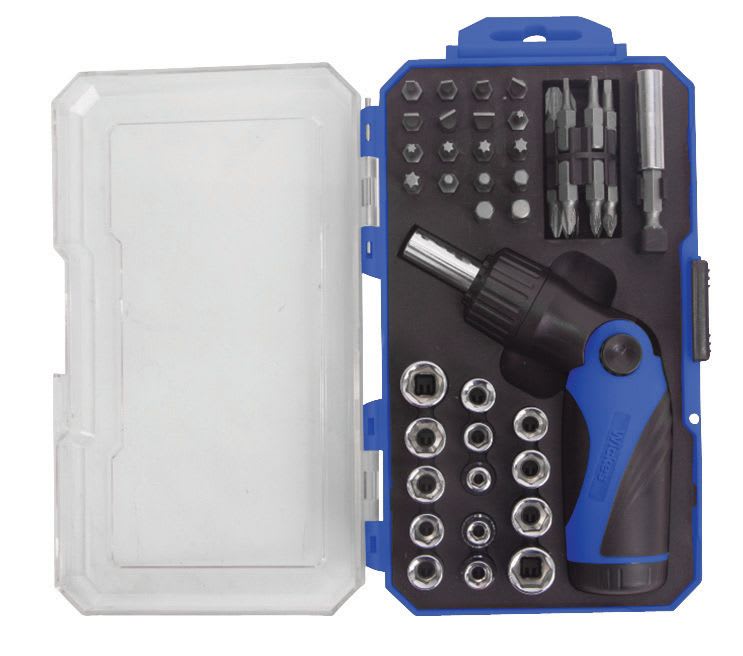 Comprehensive ratchet screwdriver set comprising of all popular socket and bit sizes. Supplied in a sturdy and practical plastic storage case. While we are introducing our new black electrophoretic anti-corrosion coating into our Hand Tools range, you may still receive the tools in a chrome finish. We are updating our range with a black electrophoretic coating that is better for people and the environment, without any impact on quality or performance.