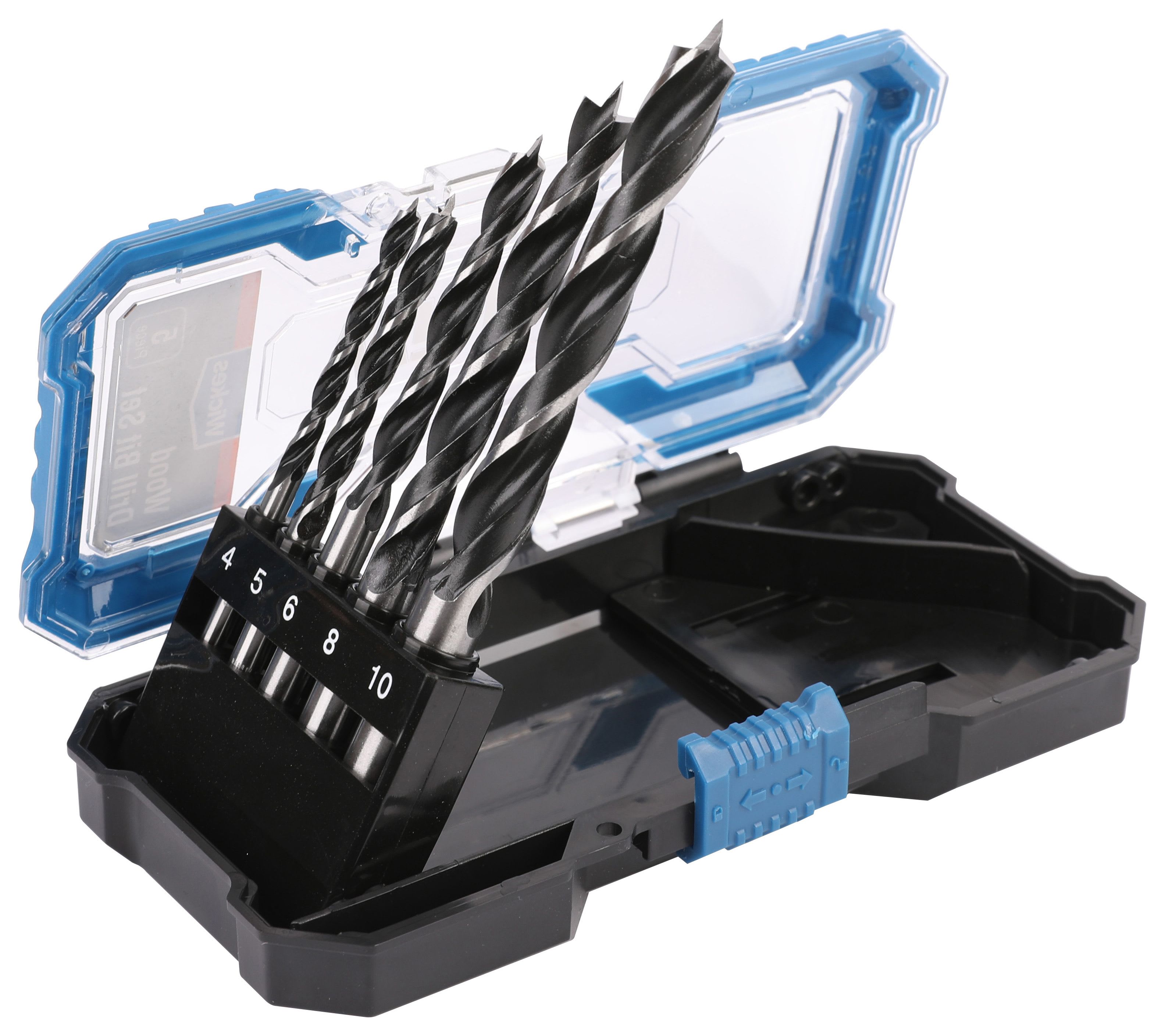 This Wickes 5 piece set of wood drill bits in diameters of 4 - 10mm with a ground cutting tip for fast penetration and flutes for effective waste clearance.