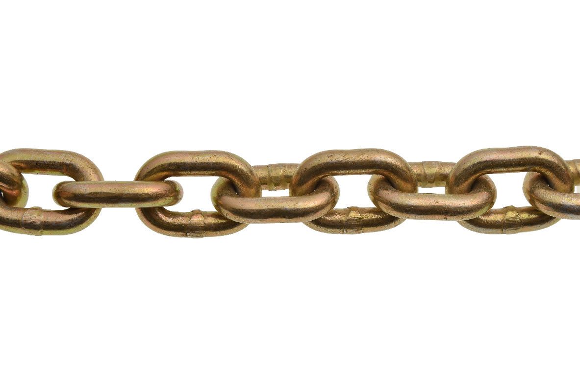 Hardened steel alloy chain plated in a durable zinc and yellow finish. Hacksaw and bolt cropper resistant. For use with a suitable padlock to secure assets