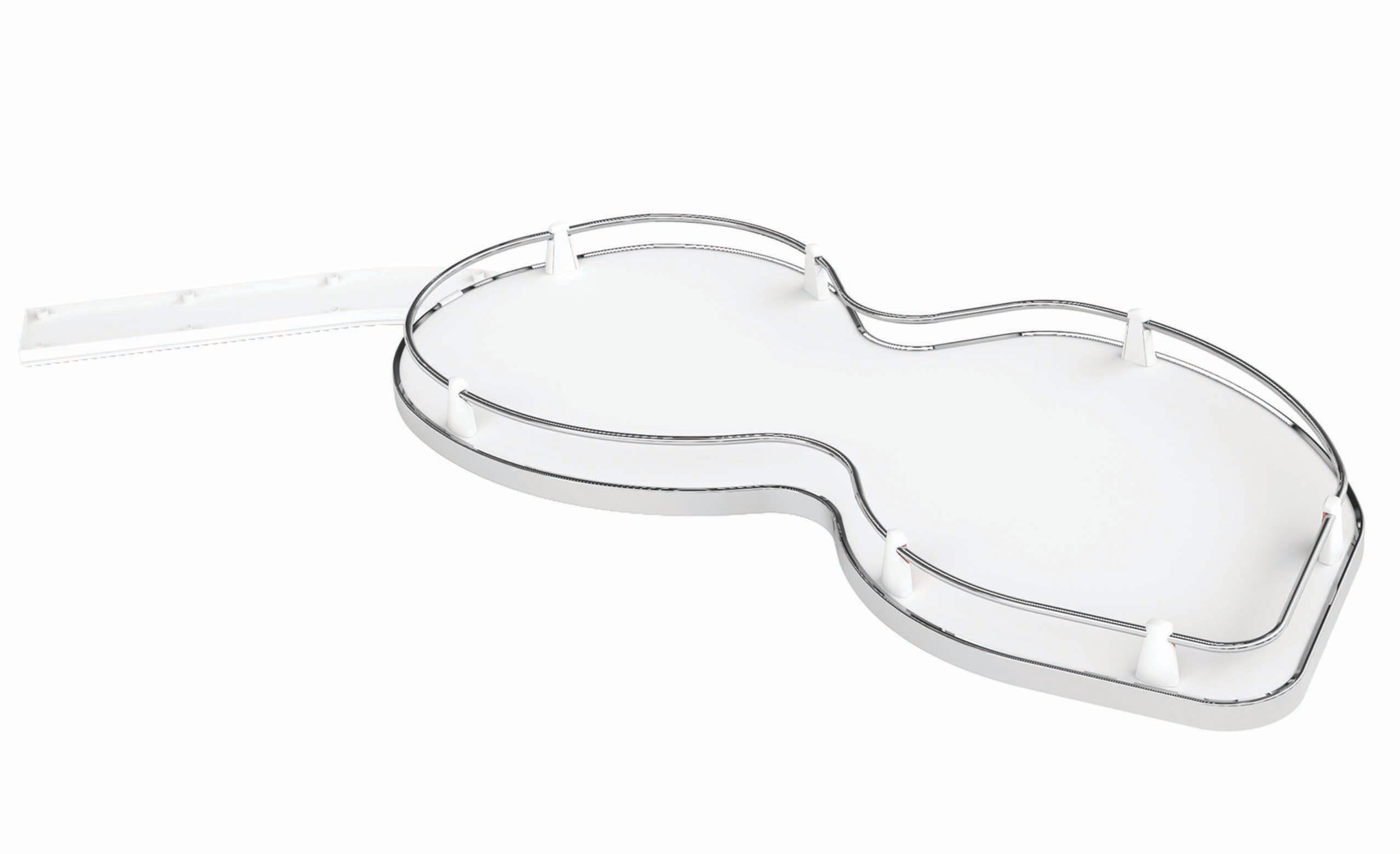 Unhanded chrome and wooden twin tray pull out solution in white and chrome finish. Easy access pullout storage for corner cupboards in Kitchen.