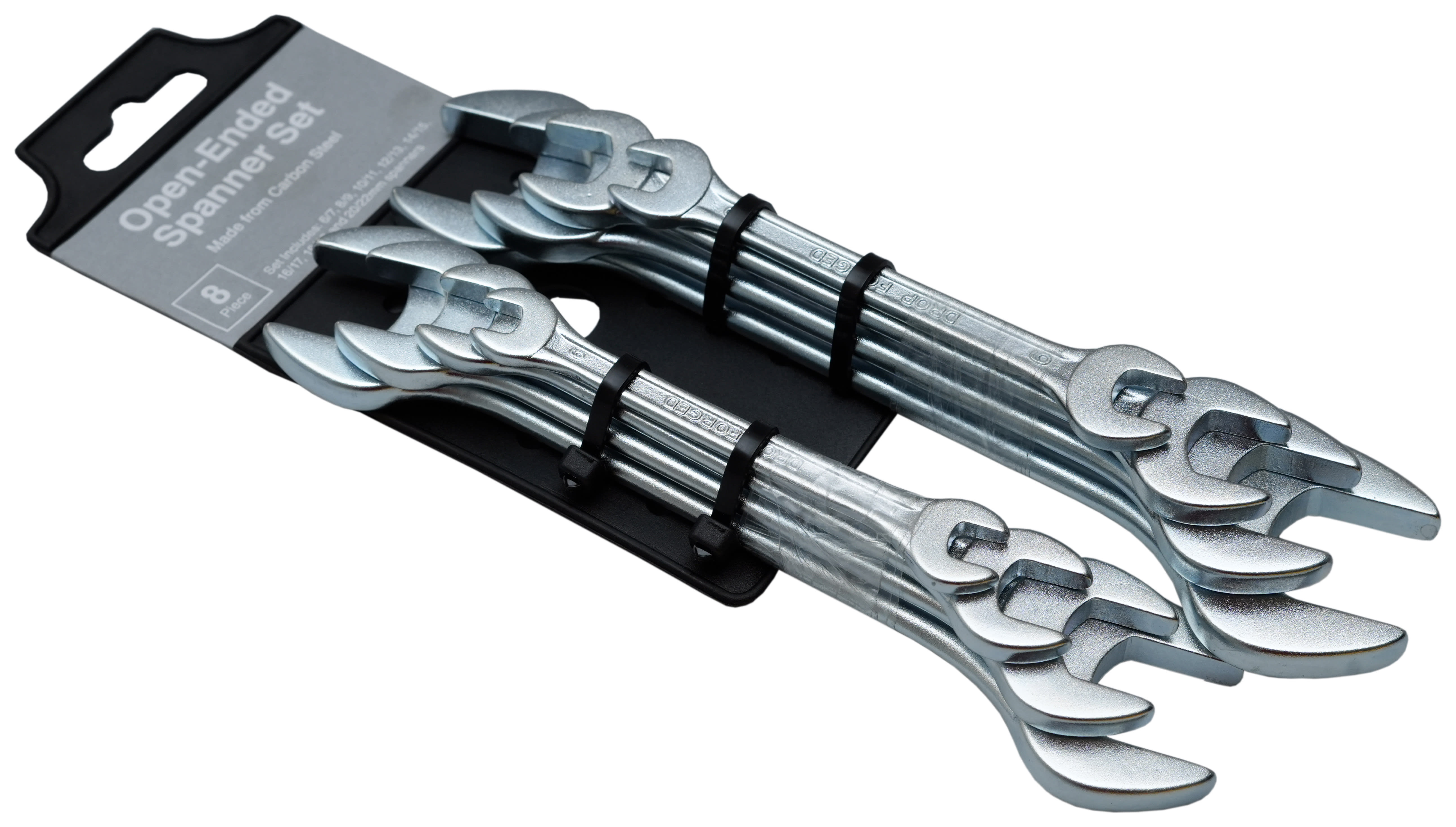 This 8 piece open ended spanner set is hardened and tempered heavy-duty zinc plated spanner set complete with wall-mountable plate holder. Set includes Sizes: 6/7, 8/9, 10/11, 12/13, 14/15, 16/17, 18/19, 20/22mm.
