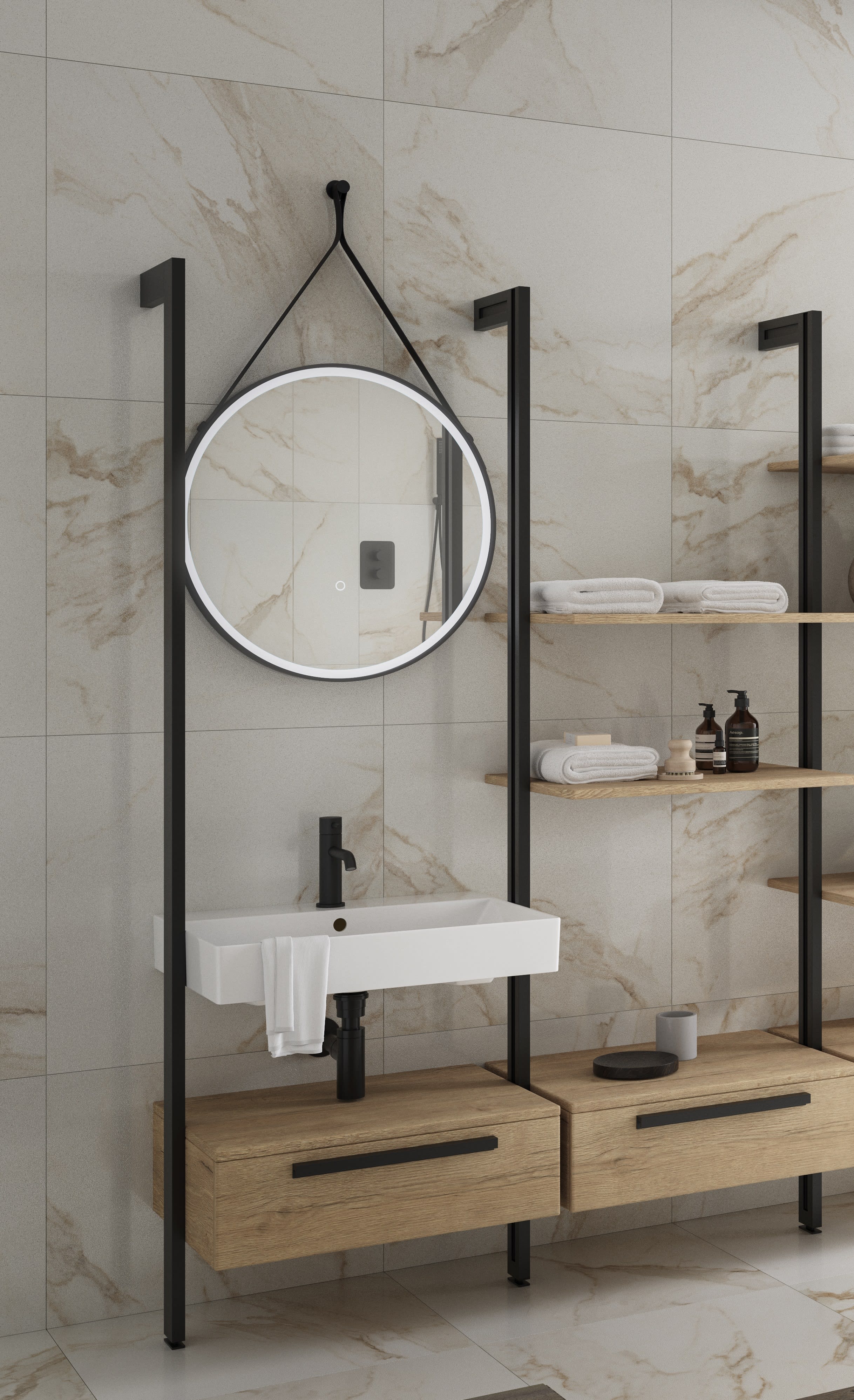 Rimini modular structure is meticulously crafted to transform your bathroom into a personalised haven. This Rimini modular system is made up of a vanity unit, tower unit, shelves and basin. The unique design of the modular system empowers you to tailor the space to your exact specifications, offering full height adjustability and flexible length options. Elevate your bathroom experience with the adaptability and customisation that the Rimini modular system brings. Giving you a space that is uniquely and distinctly yours. Tap and waste available separately.