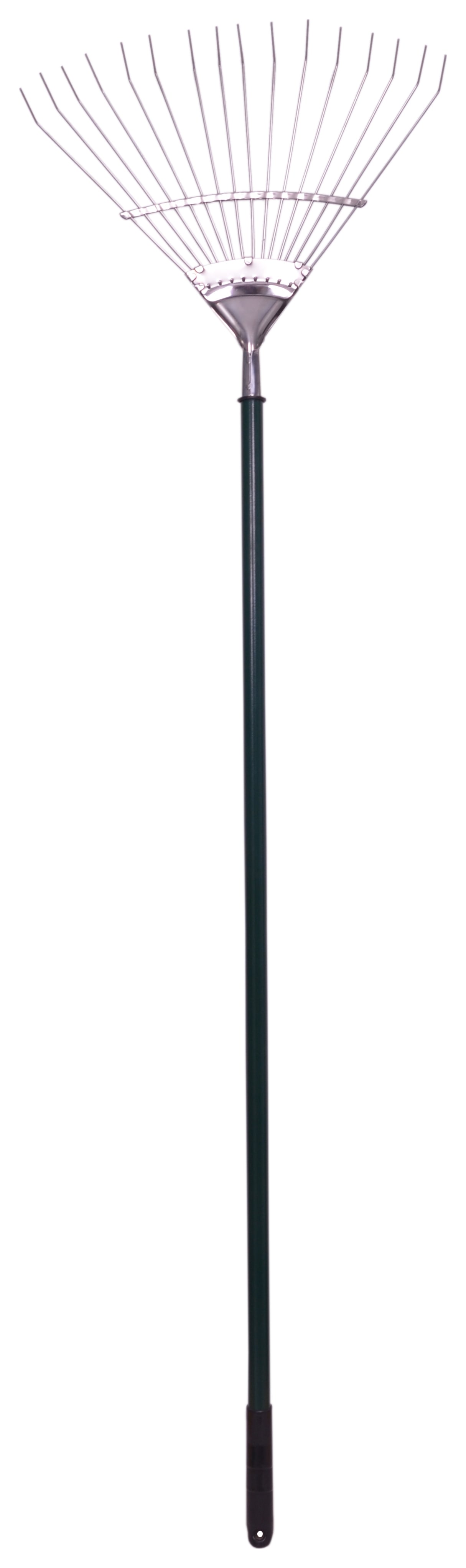 This Stainless Steel Garden Lawn Rake features a polished head with 16 flexible round stainless steel tines, designed for durability and efficient raking. The extra-long soft-grip handle ensures comfortable use, reducing strain during extended gardening tasks. The head is securely fixed to a tubular steel handle, providing both strength and stability for effective lawn maintenance.