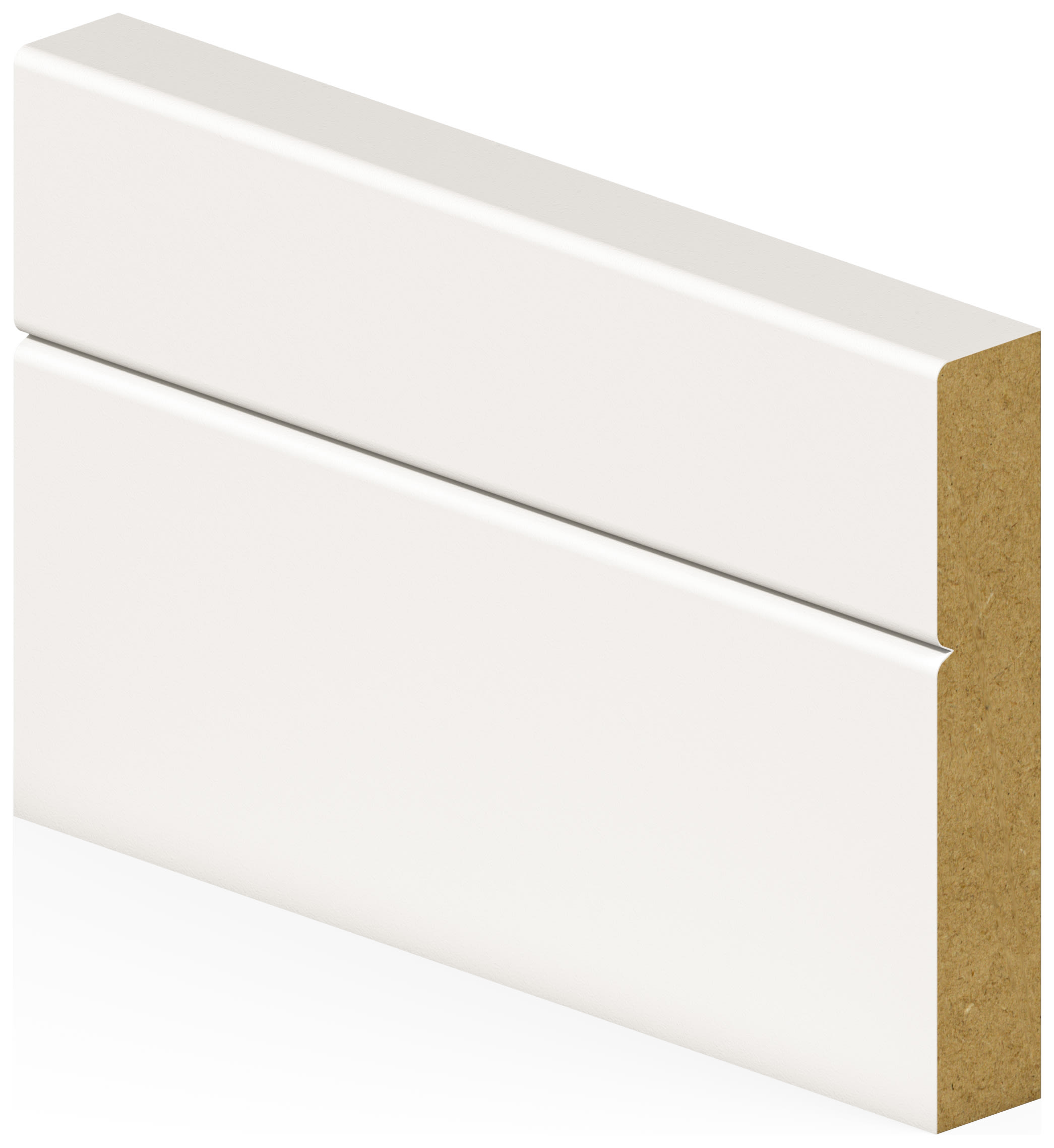 V-Groove White Primed MDF Skirting board blends a very versatile profile with a contemporary finish. Its profile allows this skirting board to look great on either a taller or shorter profile height without any compromise on its appearance. Supplied with an ideal surface for painting.