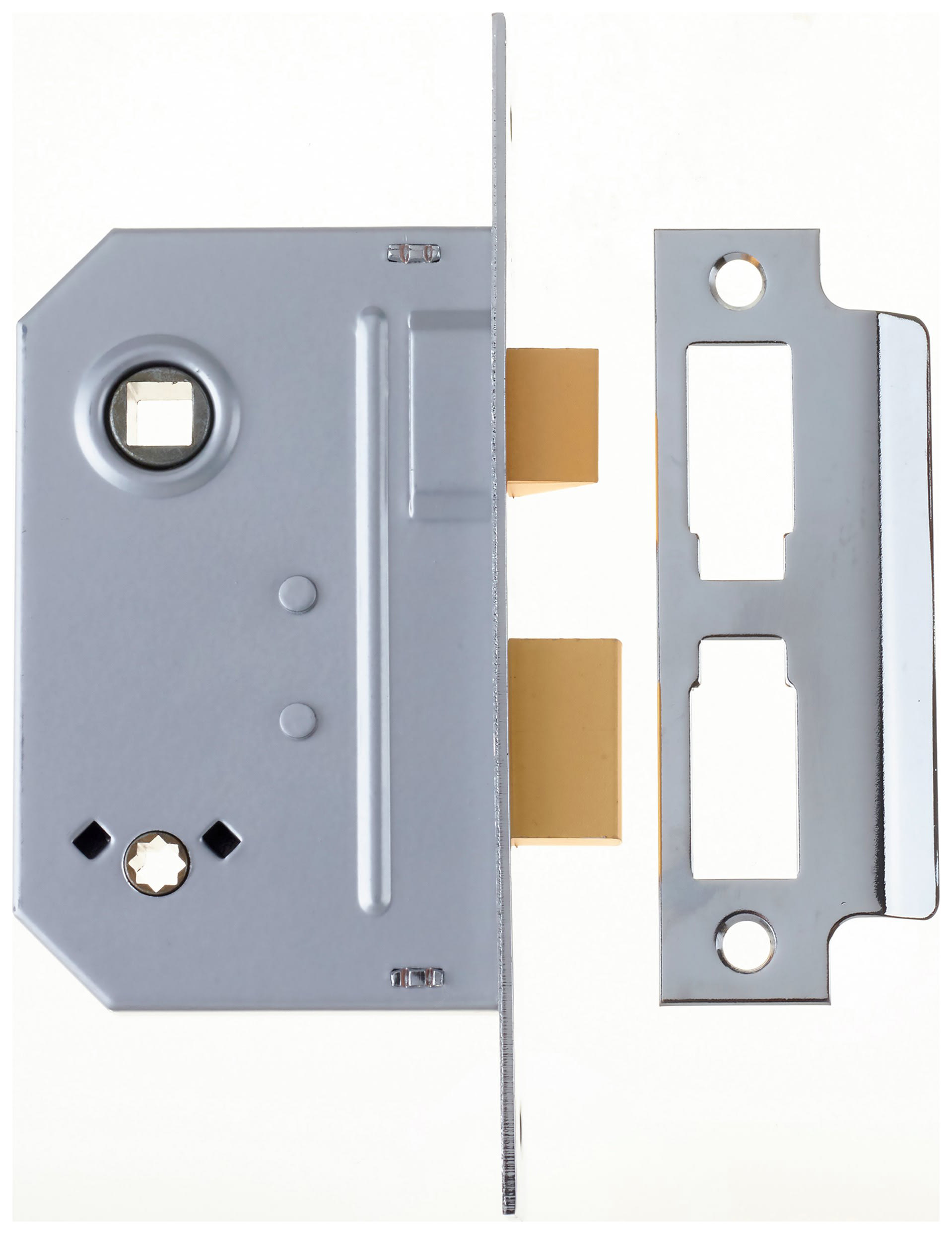 The Yale Bathroom Sashlock is ideal for bathroom doors or internal doors requiring privacy. It works with bathroom door furniture, featuring an internal thumbturn for locking and an external emergency release. The latch bolt can be operated from either side using a lever handle, while the deadbolt is locked or unlocked with a separate turn from the inside.