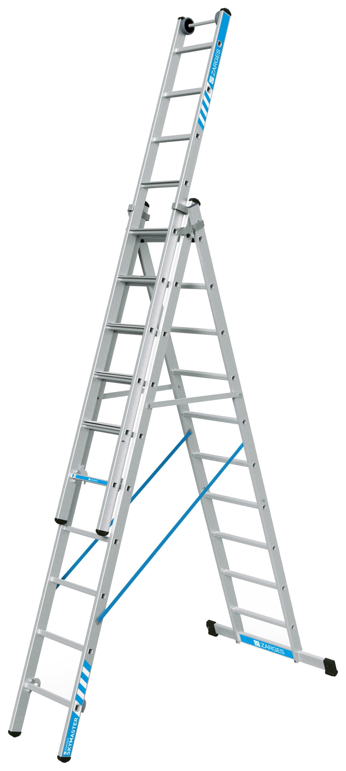 The Zarges Skymaster Plus X 3 x 10 Tread Aluminium Combination Ladder is one ladder, many functions and is the flexible solution for accessing higher places safely and providing extra stabilty. The Skymaster Plus X offers extra comfort due to the 80mm deep treads on the upper section. Manufactured in aluminium this lightweight, robust and duarable with a maximum load weight of 150kg can be used as a free standing and a frame ladder as well as a double and triple extension ladder. Fiited with perlon straps to prevent the ladder splaying and 2 locking bars for additional stability. Closed length 3.01m, working height as a 3-part ladder approximately 7.63m.