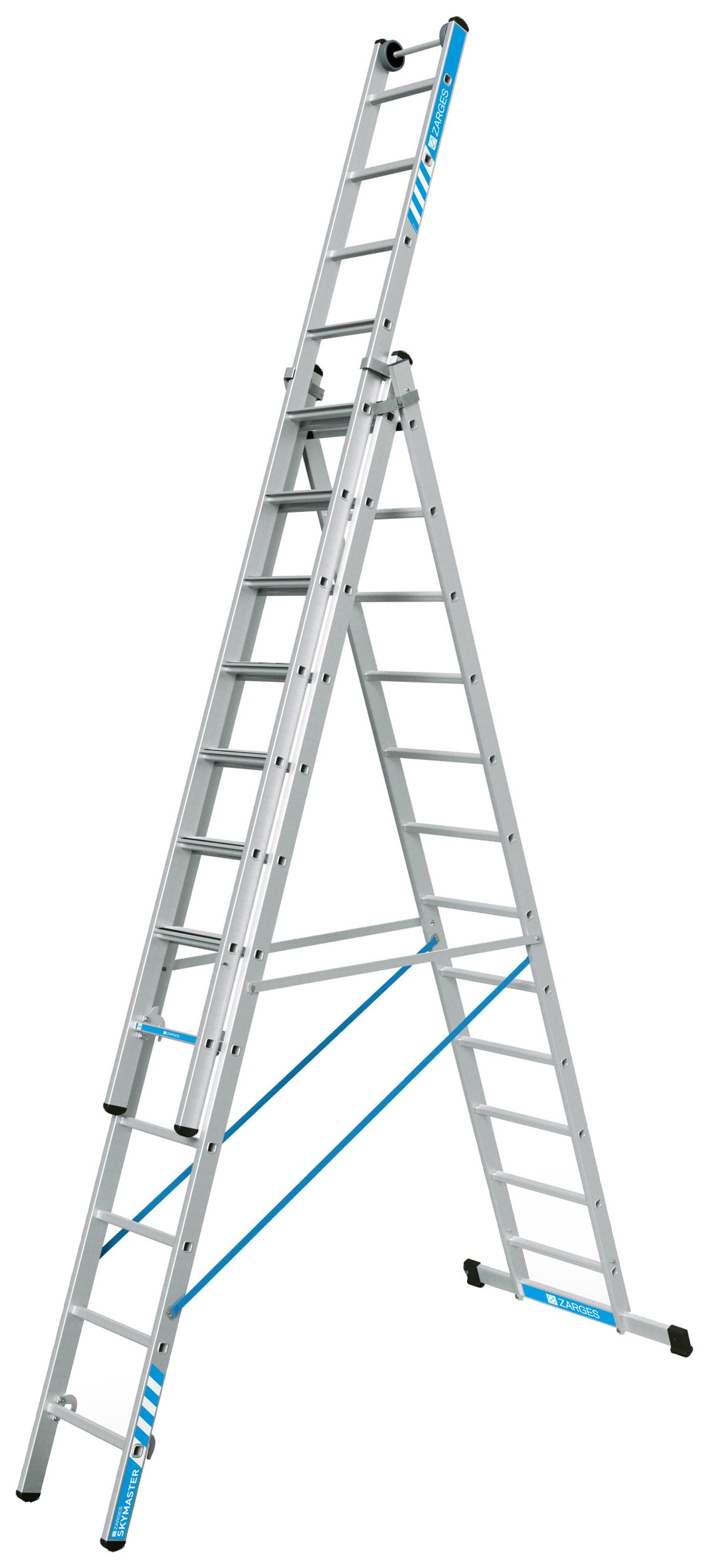 The Zarges Skymaster Plus X 3 x 12 Tread Aluminium Combination Ladder is one ladder, many functions and is the flexible solution for accessing higher places safely and providing extra stabilty. The Skymaster Plus X offers extra comfort due to the 80mm deep treads on the upper section. Manufactured in aluminium this lightweight, robust and duarable with a maximum load weight of 150kg can be used as a free standing and a frame ladder as well as a double and triple extension ladder. Fiited with perlon straps to prevent the ladder splaying and 2 locking bars for additional stability. Closed length 3.58m, working height as a 3-part ladder approximately 9.15m.