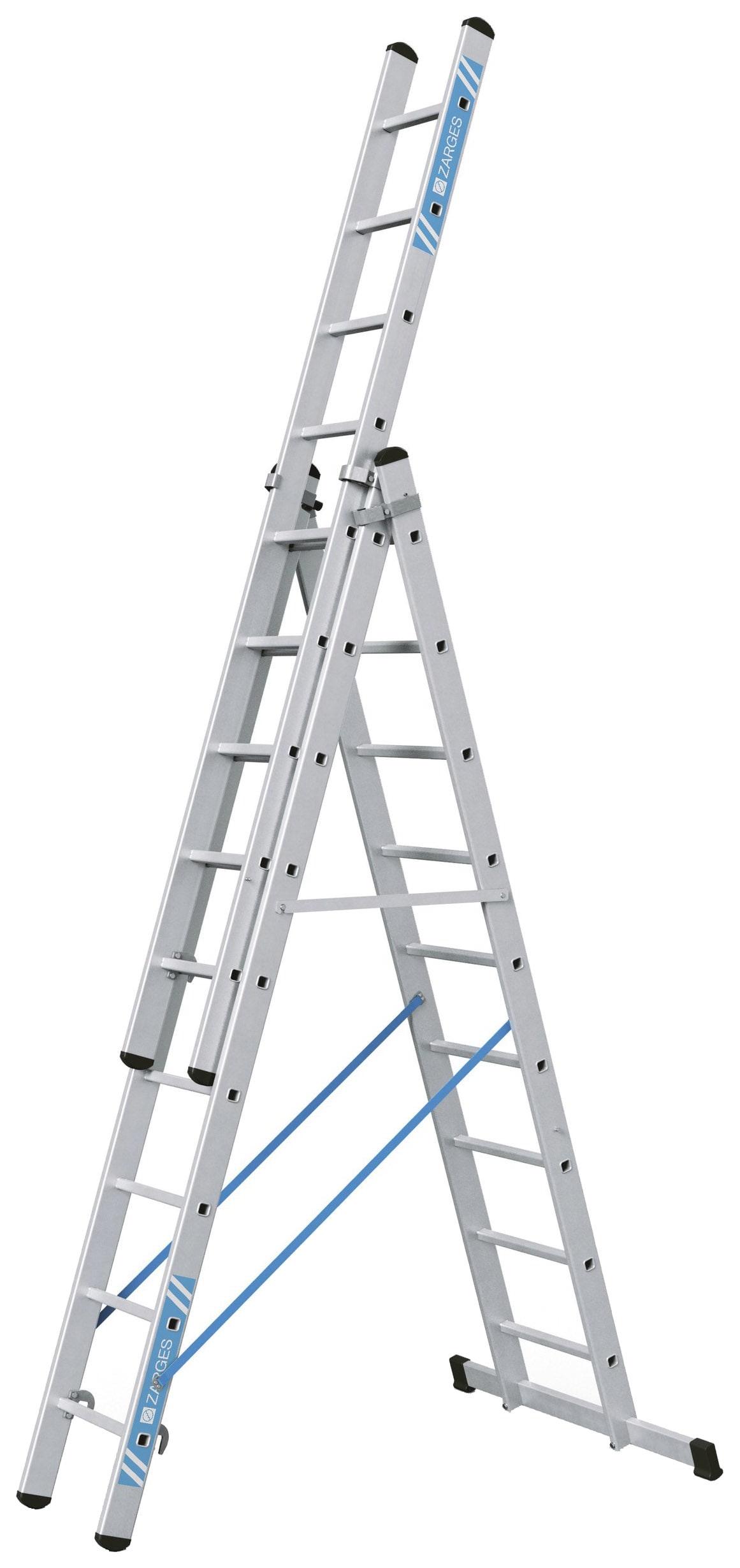 The Zarges Skymaster X 3 x 9 Tread Aluminium Combination Ladder is a trade 3-part combination ladder probably the only ladder you'll ever need! The flexible and robust Skymaster X has a reputation for never letting it's user down. Manufactured in aluminium which is lightweight, robust and duarable with a maximum load weight of 150kg can be used as a free standing and a frame ladder as well as a single, double and triple extension ladder. Fitted with perlon straps to prevent the ladder splaying and 1 locking bar for additional stability. Closed length 2.70m, working height as a 3-part ladder approximately 7.45m.