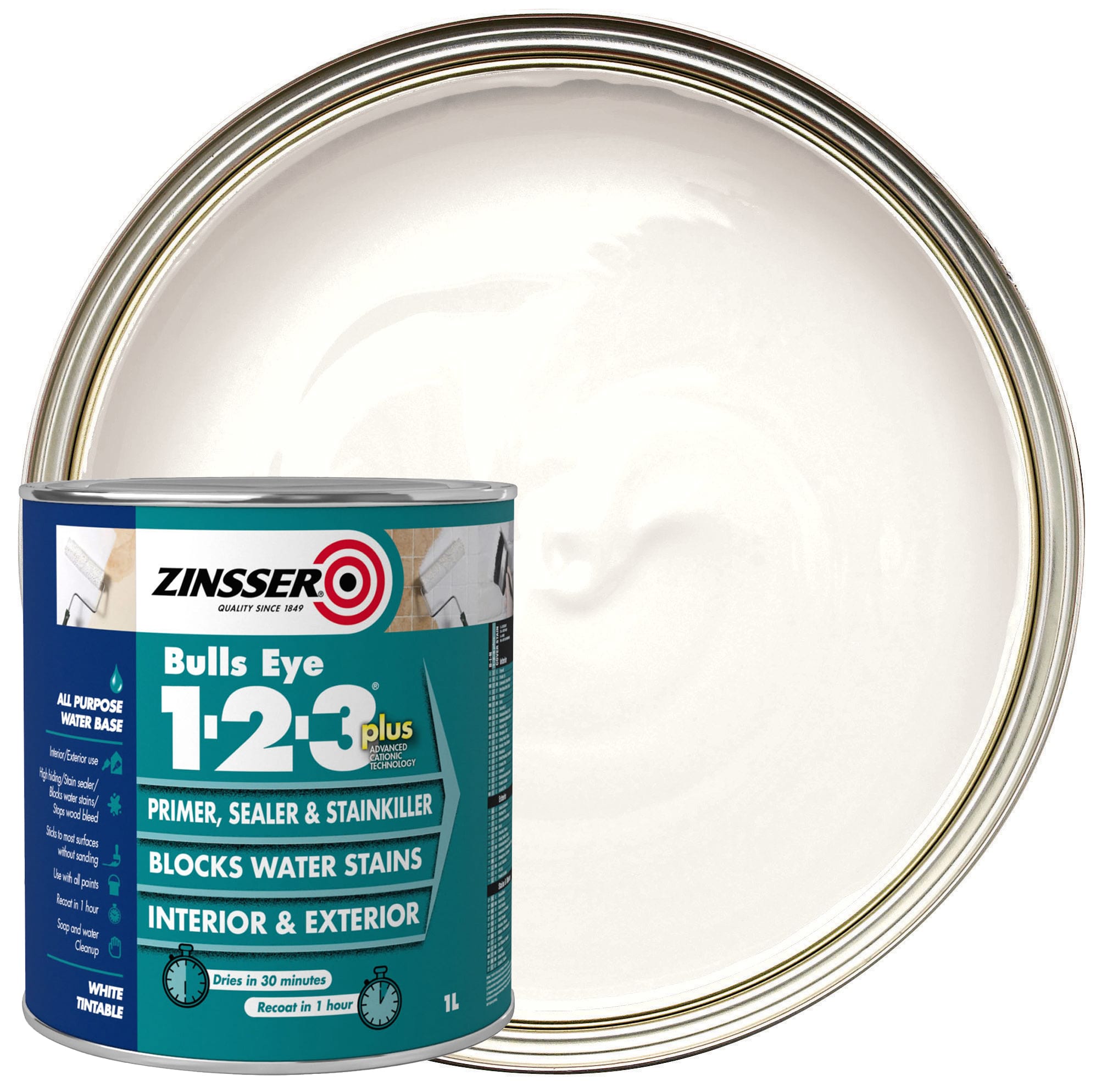 The Zinsser Bulls Eye 123 Primer Plus is a next generation universal water-based primer, sealer and stain killer. It is ideal for interior and exterior painting projects. It delivers performance benefits normally only associated with solvent-based primers, including exceptional adhesion and stain blocking. It is specially formulated to resist re-wetting, meaning it can block water soluble stains like a solvent-based primer and seal oil-soluble stains, meaning painting projects can be completed with just one primer.