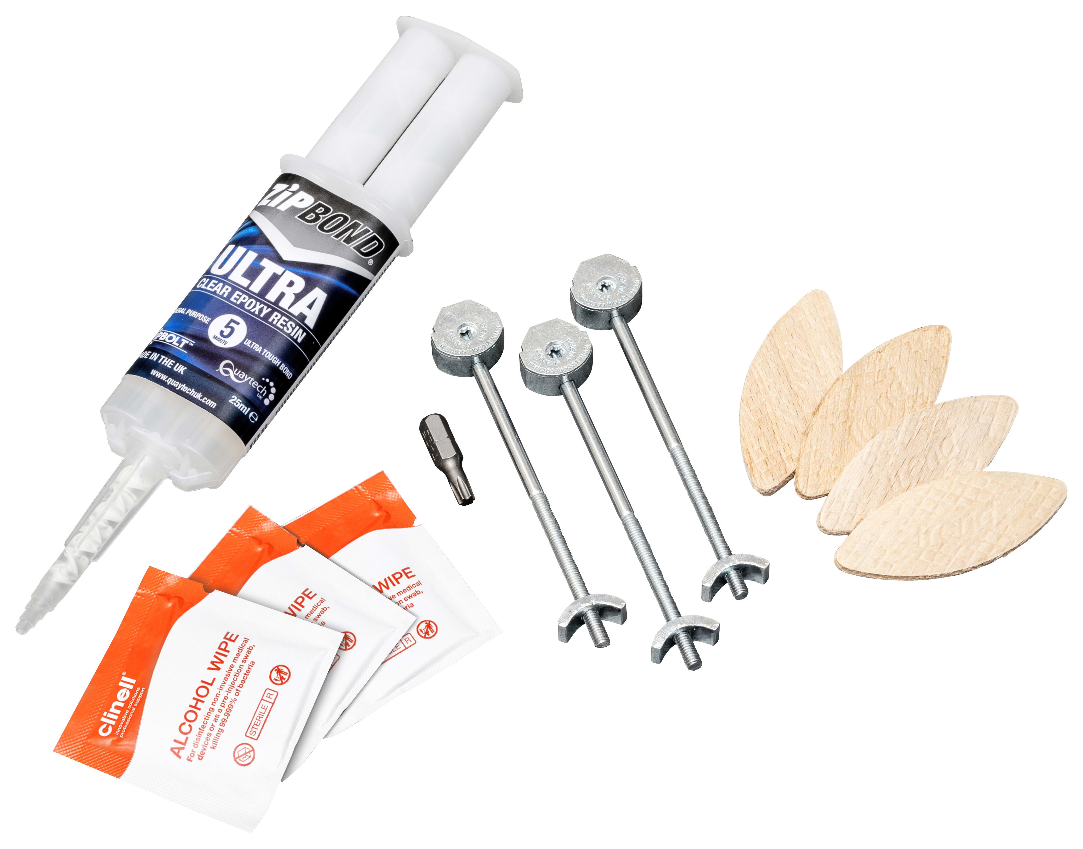 The ZIPBOLT compact laminate joining kit contains everything required to do a single join quickly and easily in compact laminate. Included are three of the ultra slim ZIPBOLT connectors along with a driver bit, biscuits, epoxy resin and wipes.