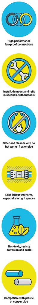 Get fast and leak-tight connections every time, with JG Speedfit's easy to install push-fit plumbing and heating system. Using a unique blend of push-fit and multi-seal technology, Speedfit can be installed and demounted in seconds without the need for tools or hot works.