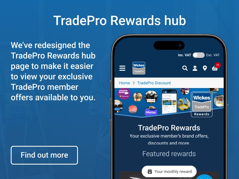 *Wickes TradePro scheme is open to tradespeople resident in the UK only. Registration and ID required. Online account required for online use. Present unique TradePro barcode at the till (or discount code at online checkout). Excludes delivery & gift vouchers. Discount on showroom kitchen & bathrooms must be claimed in person by the member. Cannot be used with other discount vouchers, codes or coupons. 1 x barcode per customer and per transaction. T&Cs apply - see https://www.wickes.co.uk/trade/terms-conditions